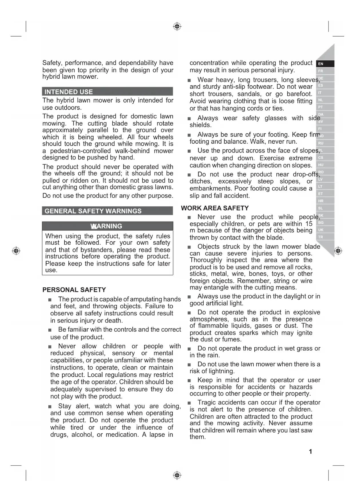 TR■ Keep children out of the mowing area and under the watchful care of a responsible adult other than the operator, be alert and turn the product off if a child enters the area. ■ Use extra care when approaching blind corners, shrubs, trees, or other objects including overhanging shrubs, which may block your view. ELECTRICAL SAFETY ■ Power plugs must match the outlet. Never modify the plug in any way. Do not use any adapter plugs with earthed (grounded) power tools. Unmodified plugs and matching outlets will reduce risk of electric shock. ■ Avoid unintentional starting. Always check that the switch is in off position before plugging in the product to the power supply. Do not carry a plugged-in product with your finger on the switch. ■ Avoid body contact with earthed or grounded surfaces, such as pipes, radiators, ranges and refrigerators. There is an increased risk of electric shock if your body is earthed or grounded. ■ Do not expose the product to rain or wet conditions. Water entering an appliance will increase the risk of electric shock. ■ Electrical power should be supplied via a residual current device (RCD) with a tripping current of not more than 30 mA. ■ Before use, check the supply and extension cord for signs of damage or aging. If the cord becomes damaged during use, disconnect the cord from the supply immediately. Do not touch the cord before disconnecting the supply. Do not use the product if the cord is damaged or worn. ■ If you need to use an extension cord, ensure it is suitable for outdoor use and has a current capacity rating sufficient to supply your product. The extension cord cable should be marked with either “H05 RN-F” or “H05 VV-F”. Check it before every use for damage, always uncoil it during use because coiled cords can overheat. Damaged extension cords should not be repaired, they should be replaced with an equivalent type. ■ Make sure the power cord is positioned so that it cannot be damaged by the cutting means and will not be stepped on, tripped over or otherwise subjected to damage or stress. ■ Never pick up or carry the product by the electric cable. ■ Never pull by the power cord to disconnect from the power supply. ■ Keep the power cord away from heat, oil and sharp edges. ■ Make sure voltage is correct for the product. A nameplate on the product indicates the product’s voltage. Never connect the product to an AC voltage that differs from this voltage. ■ Always ensure the cord from the handlebar to the mower body is never trapped, pinched or otherwise damaged during assembly or handle folding. Never apply power to the mower if this cable is damaged. Bring the product to an authorised service centre for professional repair.