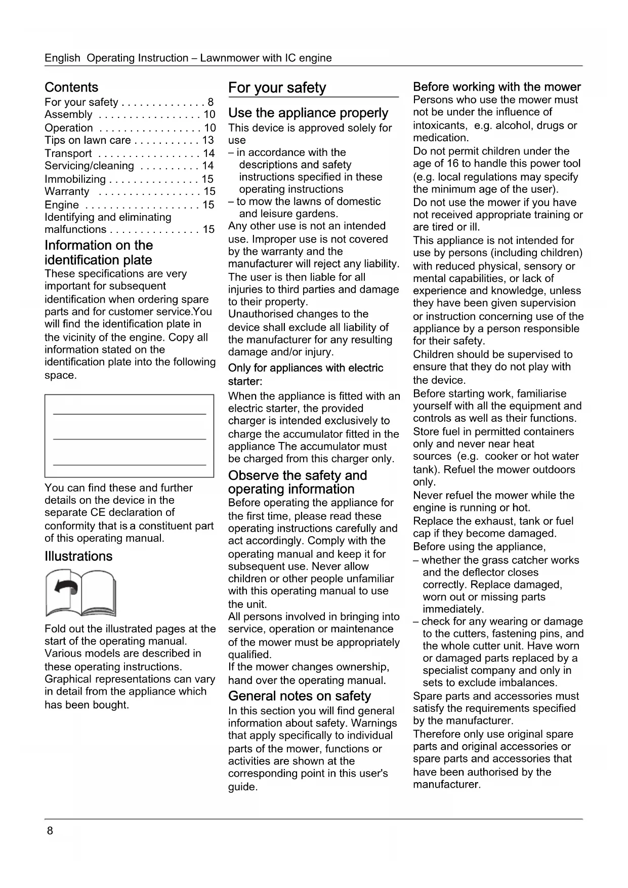 detail from the appliance which has been bought. For your safety Use the appliance properly This device is approved solely for use – in accordance with the descriptions and safety instructions specified in these operating instructions – to mow the lawns of domestic and leisure gardens. Any other use is not an intended use. Improper use is not covered by the warranty and the manufacturer will reject any liability. The user is then liable for all injuries to third parties and damage to their property. Unauthorised changes to the device shall exclude all liability of the manufacturer for any resulting damage and/or injury. Only for appliances with electric starter: When the appliance is fitted with an electric starter, the provided charger is intended exclusively to charge the accumulator fitted in the appliance The accumulator must be charged from this charger only. Observe the safety and operating information Before operating the appliance for the first time, please read these operating instructions carefully and act accordingly. Comply with the operating manual and keep it for subsequent use. Never allow children or other people unfamiliar with this operating manual to use the unit. All persons involved in bringing into service, operation or maintenance of the mower must be appropriately qualified. If the mower changes ownership, hand over the operating manual. General notes on safety In this section you will find general information about safety. Warnings that apply specifically to individual parts of the mower, functions or activities are shown at the corresponding point in this user's guide. Before working with the mower Persons who use the mower must not be under the influence of intoxicants, e.g. alcohol, drugs or medication. Do not permit children under the age of 16 to handle this power tool (e.g. local regulations may specify the minimum age of the user). Do not use the mower if you have not received appropriate training or are tired or ill. This appliance is not intended for use by persons (including children) with reduced physical, sensory or mental capabilities, or lack of experience and knowledge, unless they have been given supervision or instruction concerning use of the appliance by a person responsible for their safety. Children should be supervised to ensure that they do not play with the device. Before starting work, familiarise yourself with all the equipment and controls as well as their functions. Store fuel in permitted containers only and never near heat sources (e.g. cooker or hot water tank). Refuel the mower outdoors only. Never refuel the mower while the engine is running or hot. Replace the exhaust, tank or fuel cap if they become damaged. Before using the appliance, – whether the grass catcher works and the deflector closes correctly. Replace damaged, worn out or missing parts immediately. – check for any wearing or damage to the cutters, fastening pins, and the whole cutter unit. Have worn or damaged parts replaced by a specialist company and only in sets to exclude imbalances. Spare parts and accessories must satisfy the requirements specified by the manufacturer. Therefore only use original spare parts and original accessories or spare parts and accessories that have been authorised by the manufacturer.Operating Instruction – Lawnmower with IC engine English