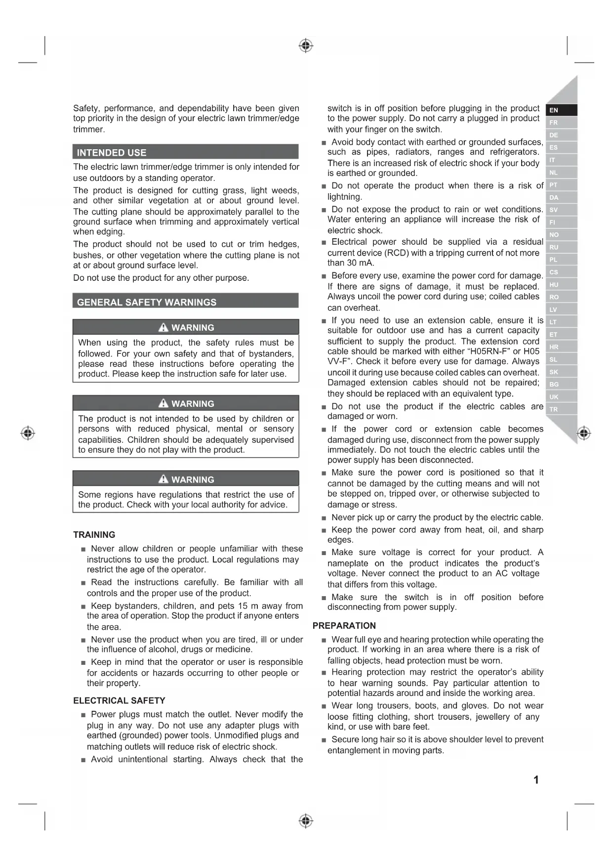 WARNING When using the product, the safety rules must be followed. For your own safety and that of bystanders, please read these instructions before operating the product. Please keep the instruction safe for later use. WARNING The product is not intended to be used by children or persons with reduced physical, mental or sensory capabilities. Children should be adequately supervised to ensure they do not play with the product. WARNING Some regions have regulations that restrict the use of the product. Check with your local authority for advice. TRAINING ■ Never allow children or people unfamiliar with these instructions to use the product. Local regulations may restrict the age of the operator. ■ Read the instructions carefully. Be familiar with all controls and the proper use of the product. ■ Keep bystanders, children, and pets 15 m away from the area of operation. Stop the product if anyone enters the area. ■ Never use the product when you are tired, ill or under the influence of alcohol, drugs or medicine. ■ Keep in mind that the operator or user is responsible for accidents or hazards occurring to other people or their property. ELECTRICAL SAFETY ■ Power plugs must match the outlet. Never modify the plug in any way. Do not use any adapter plugs with earthed (grounded) power tools. Unmodified plugs and matching outlets will reduce risk of electric shock. ■ Avoid unintentional starting. Always check that the switch is in off position before plugging in the product to the power supply. Do not carry a plugged in product with your finger on the switch. ■ Avoid body contact with earthed or grounded surfaces, such as pipes, radiators, ranges and refrigerators. There is an increased risk of electric shock if your body is earthed or grounded. ■ Do not operate the product when there is a risk of lightning. ■ Do not expose the product to rain or wet conditions. Water entering an appliance will increase the risk of electric shock. ■ Electrical power should be supplied via a residual current device (RCD) with a tripping current of not more than 30 mA. ■ Before every use, examine the power cord for damage. If there are signs of damage, it must be replaced. Always uncoil the power cord during use; coiled cables can overheat. ■ If you need to use an extension cable, ensure it is suitable for outdoor use and has a current capacity sufficient to supply the product. The extension cord cable should be marked with either “H05RN-F” or H05 VV-F”. Check it before every use for damage. Always uncoil it during use because coiled cables can overheat. Damaged extension cables should not be repaired; they should be replaced with an equivalent type. ■ Do not use the product if the electric cables are damaged or worn. ■ If the power cord or extension cable becomes damaged during use, disconnect from the power supply immediately. Do not touch the electric cables until the power supply has been disconnected. ■ Make sure the power cord is positioned so that it cannot be damaged by the cutting means and will not be stepped on, tripped over, or otherwise subjected to damage or stress. ■ Never pick up or carry the product by the electric cable. ■ Keep the power cord away from heat, oil, and sharp edges. ■ Make sure voltage is correct for your product. A nameplate on the product indicates the product’s voltage. Never connect the product to an AC voltage that differs from this voltage. ■ Make sure the switch is in off position before disconnecting from power supply. PREPARATION ■ Wear full eye and hearing protection while operating the product. If working in an area where there is a risk of falling objects, head protection must be worn. ■ Hearing protection may restrict the operator’s ability to hear warning sounds. Pay particular attention to potential hazards around and inside the working area. ■ Wear long trousers, boots, and gloves. Do not wear loose fitting clothing, short trousers, jewellery of any kind, or use with bare feet. ■ Secure long hair so it is above shoulder level to prevent entanglement in moving parts.2 | English ■ Before use and after any impact, check that there are no damaged parts. A defective switch or any part that is damaged or worn should be properly repaired or replaced by an authorised service centre. ■ Make sure the cutting attachment is properly installed and securely fastened. ■ Never operate the product unless all guards, deflectors, and handles are properly and securely attached. ■ Consider the environment in which you are working. Keep the working area free from wires, sticks, stones and debris that if struck by the cutter, can become thrown objects.