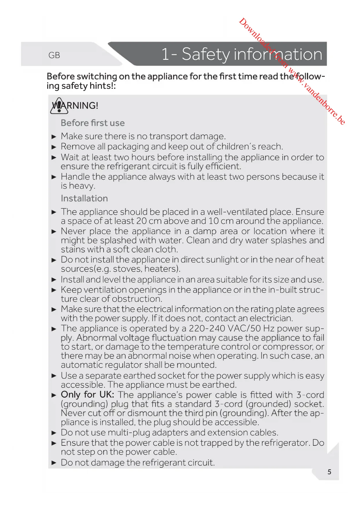 ing safety hints!: WARNING! Make sure there is no transport damage. Remove all packaging and keep out of children´s reach. Wait at least two hours before installing the appliance in order to Handle the appliance always with at least two persons because it is heavy. Installation The appliance should be placed in a well-ventilated place. Ensure a space of at least 20 cm above and 10 cm around the appliance. Never place the appliance in a damp area or location where it might be splashed with water. Clean and dry water splashes and stains with a soft clean cloth. Do not install the appliance in direct sunlight or in the near of heat sources(e.g. stoves, heaters). Install and level the appliance in an area suitable for its size and use. Keep ventilation openings in the appliance or in the in-built struc- ture clear of obstruction. Make sure that the electrical information on the rating plate agrees with the power supply. If it does not, contact an electrician. The appliance is operated by a 220-240 VAC/50 Hz power sup- to start, or damage to the temperature control or compressor, or there may be an abnormal noise when operating. In such case, an automatic regulator shall be mounted. Use a separate earthed socket for the power supply which is easy accessible. The appliance must be earthed. Only for UK: