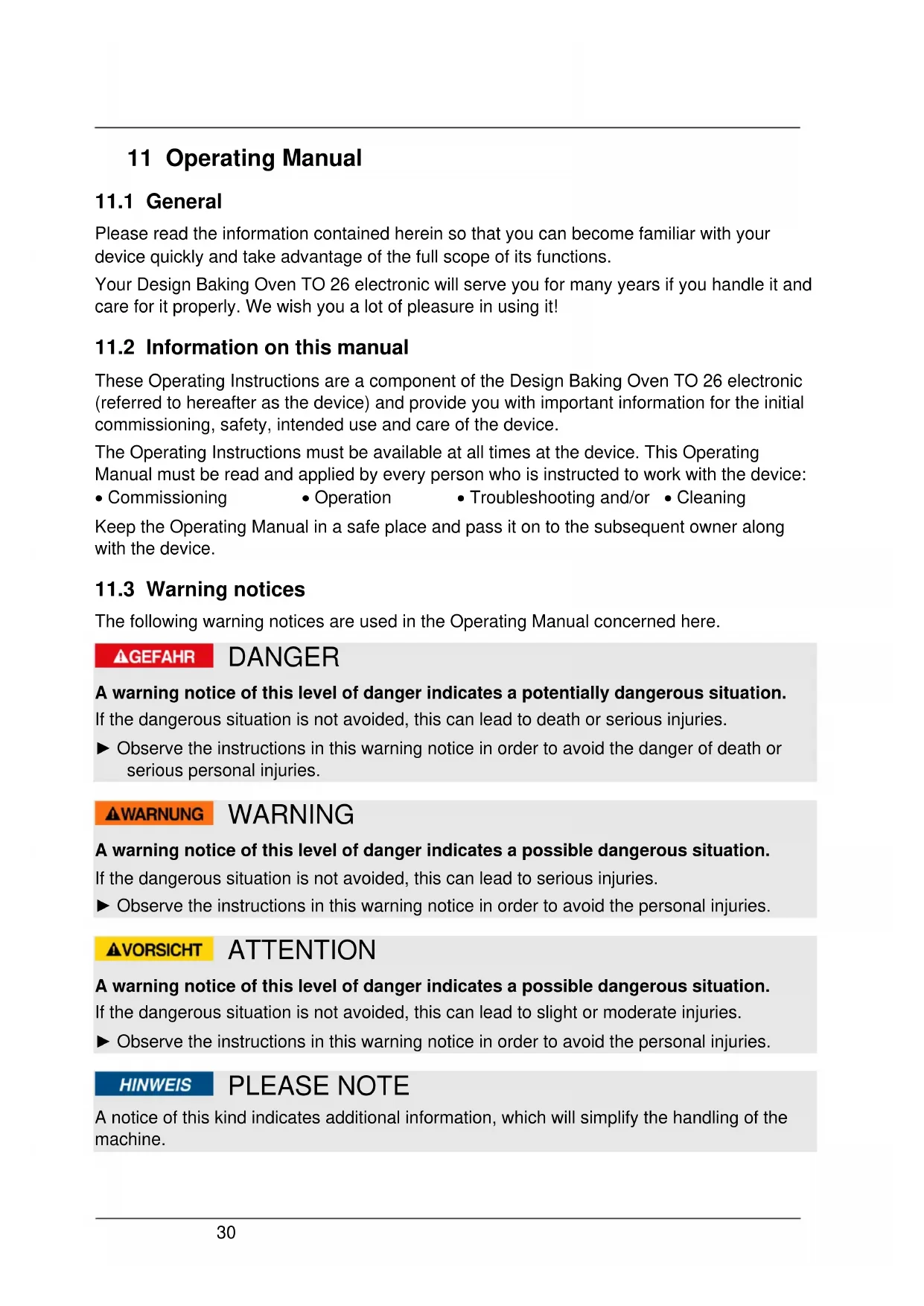 These Operating Instructions are a component of the Design Baking Oven TO 26 electronic (referred to hereafter as the device) and provide you with important information for the initial commissioning, safety, intended use and care of the device. The Operating Instructions must be available at all times at the device. This Operating Manual must be read and applied by every person who is instructed to work with the device: Commissioning Operation Troubleshooting and/or Cleaning Keep the Operating Manual in a safe place and pass it on to the subsequent owner along with the device.