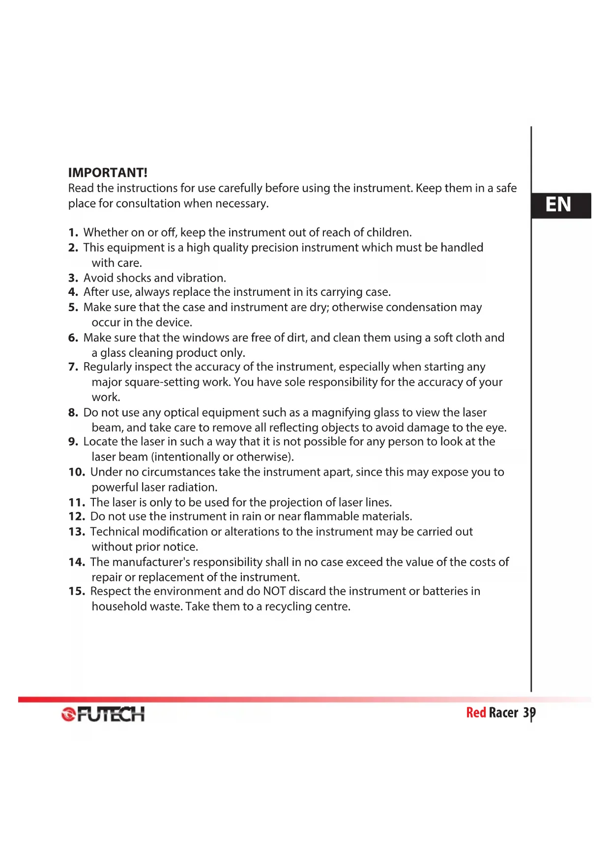 Download the instructions for your Laser level in PDF format for free! Find your manual Red Racer - FUTECH and take your electronic device back in hand. On this page are published all the documents necessary for the use of your device. Red Racer by FUTECH.