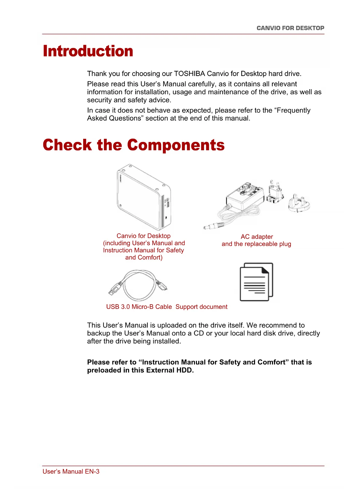 Introduction Thank you for choosing our TOSHIBA Canvio for Desktop hard drive. Please read this User’s Manual carefully, as it contains all relevant information for installation, usage and maintenance of the drive, as well as security and safety advice. In case it does not behave as expected, please refer to the “Frequently Asked Questions” section at the end of this manual. Check the Components This User’s Manual is uploaded on the drive itself. We recommend to backup the User’s Manual onto a CD or your local hard disk drive, directly after the drive being installed. Please refer to “Instruction Manual for Safety and Comfort” that is preloaded in this External HDD. Canvio for Desktop (including User’s Manual and Instruction Manual for Safety and Comfort) AC adapter and the replaceable plug USB 3.0 Micro-B Cable Support documentUser’s Manual EN-4