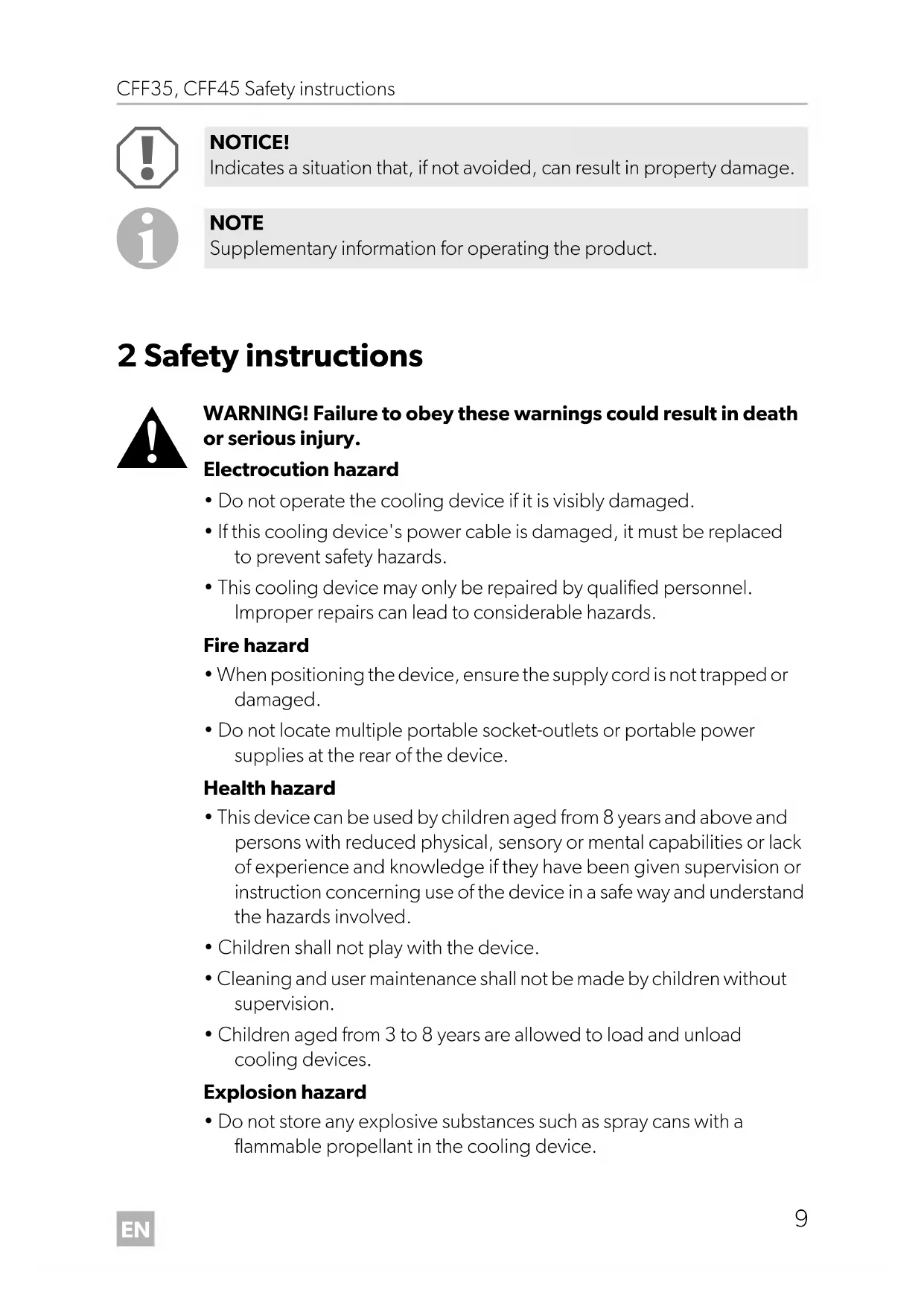 - Do not store any explosive substances such as spray cans with a flammable propellant in the cooling device. NOTICE! Indicates a situation that, if not avoided, can result in property damage. NOTE Supplementary information for operating the product. DometicCFF35-45_OPM_4445102909_EMEA16.book Seite 9 Donnerstag, 13. Februar 2020 2:24 14EN Safety instructions CFF35, CFF45