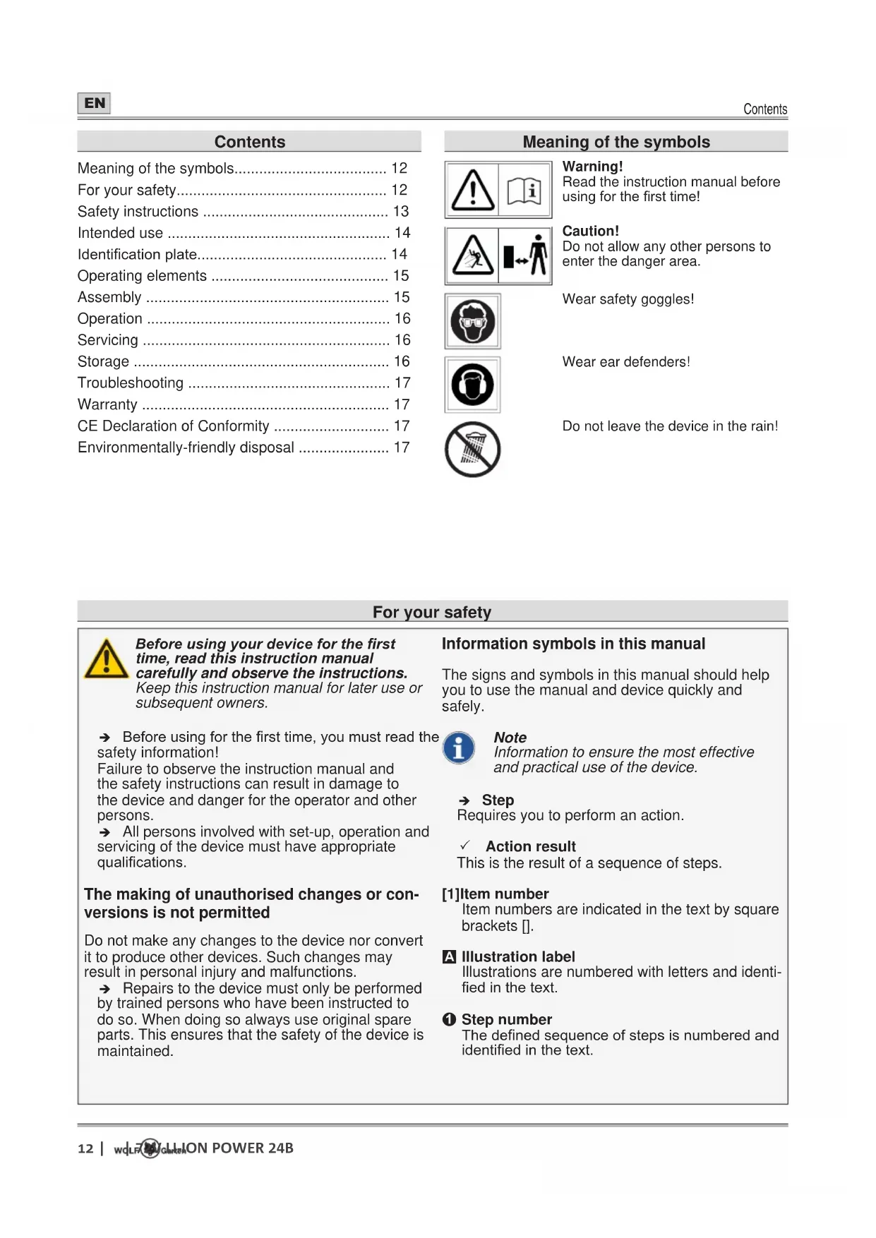 Safety instructions Danger levels of warning information The following danger levels are used in this instruc- tion manual to indicate potentially dangerous situations: DANGER ! A dangerous situation is highly likely and, if the measures are not followed, will result in severe injury and even death. WARNING ! A dangerous situation may occur and, if the measures are not followed, will result in severe injury and even death. CAUTION ! A dangerous situation may occur and, if the measures are not followed, will result in slight or minor injuries. Attention ! A possibly harmful situation may occur which if not avoided will result in property damage. Safety information content DANGER ! Type and source of the danger! ÂConsequences of non-observation ¾ Measure for preventing the danger Protection of yourself and others ¾ For safety reasons, children or persons who are not familiar with the instruction manual and operation of the leaf blower, must not use it. The minimum age of users may be dened by local or national legislation. ¾ Do not operate the leaf blower when there are people (especially children) or animals in the immediate vicinity. Ensure children do not play with the leaf blower. ¾ Stop using the device if persons (especially children) or animals are nearby. Do not allow any other persons to enter the danger area. ¾ This device must not be used by children or persons with reduced physical, sensory or mental capabilities or with inadequate experi- ence and knowledge. Likewise persons must be familiar with this instruction manual before using the device. The minimum age for using the device may be specied by local or national legislation. ¾ Cleaning and servicing may not be carried out by children. ¾ Always wear sturdy shoes and long trousers as well as other appropriate personal protec- tive equipment (safety glasses, ear defenders, safety gloves etc.) when working with the leaf blower. The wearing of personal protective equipment minimises the risk of injury. ¾ Persons operating the device must not be un- dertheinuenceofintoxicants(e.g.alcohol, drugs or medicines). ¾ The operator or user is responsible for acci- dents, injuries to other people or damage to their property. Before use ¾ Before use, make sure you are familiar with the leaf blower, its functions and controls. ¾ Do not use any leaf blower whose switch is defective and which can no longer be switched on or off. It must be repaired by a qualied expert or workshop. ¾ Read and observe the operating instructions of the power pack and its charger. When in use ¾ Remove the power pack from the device: - Whenever you leave the device unattended. - Before removing blockages. - Before checking cleaning or working on the device. - After impacting a foreign body to check the de- vice for damage. - For immediate checking if the device starts to vibrate excessively. ¾ Never leave the leaf blower unattended during breaks and store it in a secure location. ¾ Wear suitable safety goggles and ear defend- ers!14 | | V LI-ION POWER B Safety instructions