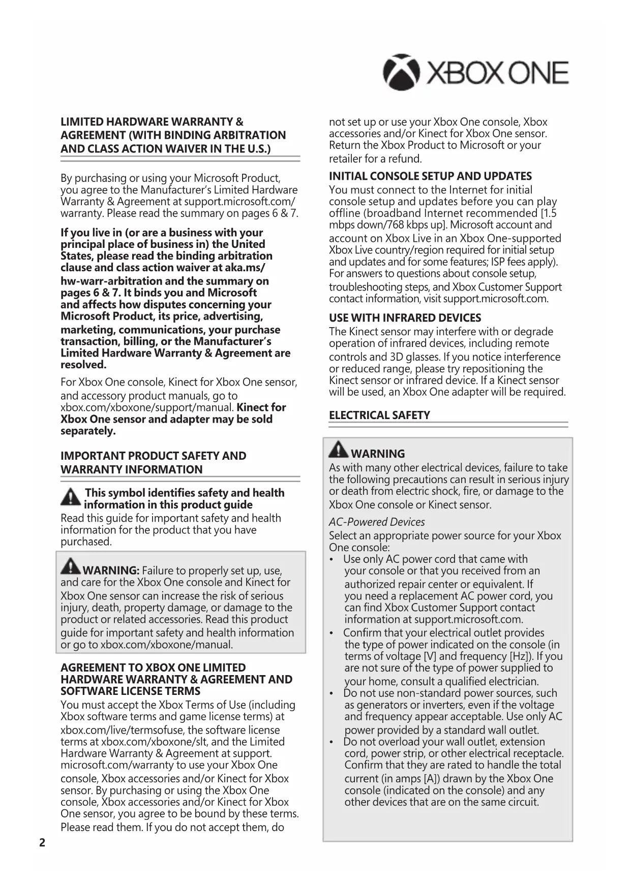AND CLASS ACTION WAIVER IN THE U.S.) By purchasing or using your Microsoft Product, you agree to the Manufacturer’s Limited Hardware Warranty & Agreement at support.microsoft.com/ warranty. Please read the summary on pages 6 & 7. If you live in (or are a business with your principal place of business in) the United States, please read the binding arbitration clause and class action waiver at aka.ms/ hw-warr-arbitration and the summary on pages 6 & 7. It binds you and Microsoft and affects how disputes concerning your Microsoft Product, its price, advertising, marketing, communications, your purchase transaction, billing, or the Manufacturer’s Limited Hardware Warranty & Agreement are resolved. For Xbox One console, Kinect for Xbox One sensor, and accessory product manuals, go to xbox.com/xboxone/support/manual. Kinect for Xbox One sensor and adapter may be sold separately.