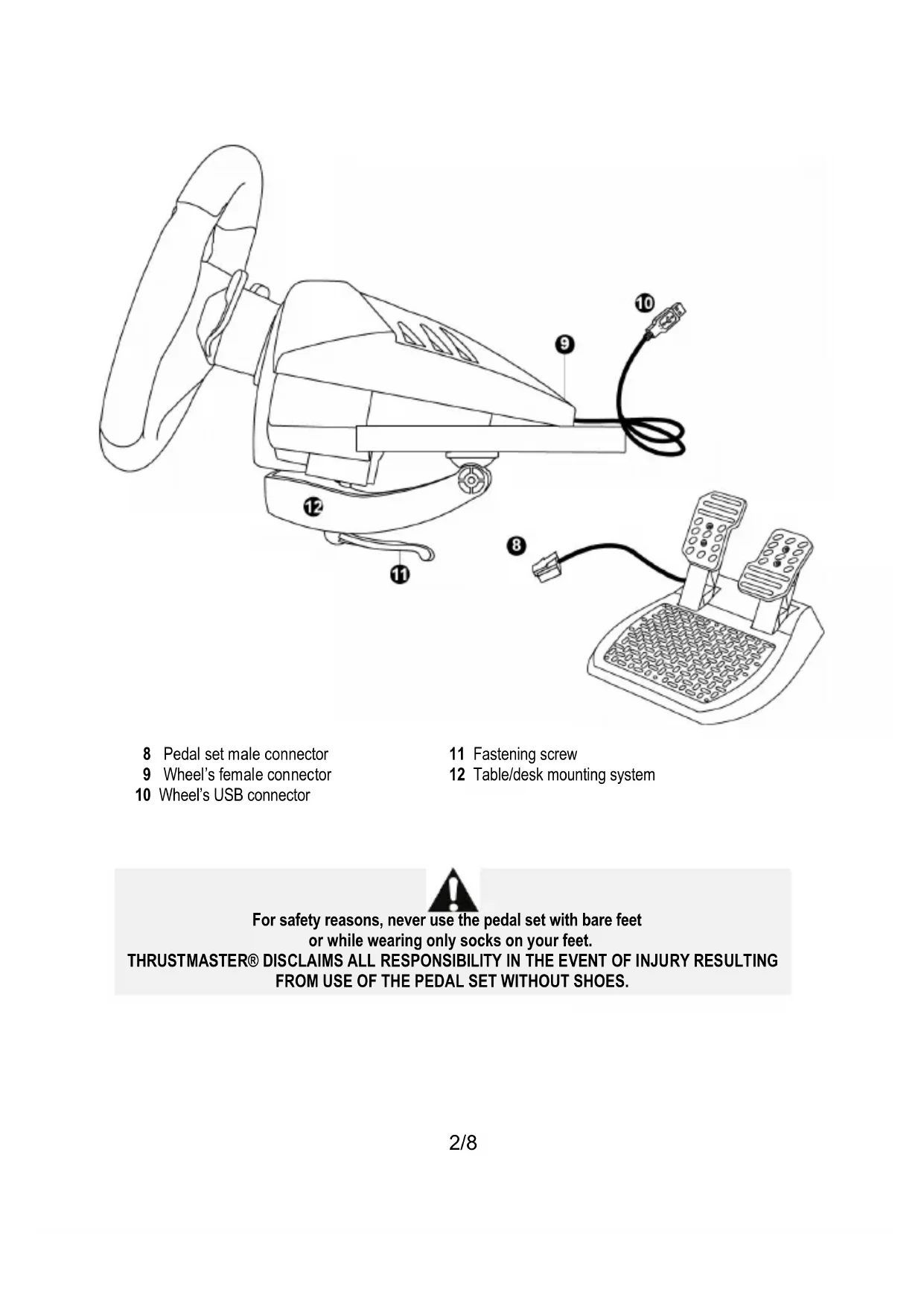For safety reasons, never use the pedal set with bare feet or while wearing only socks on your feet. THRUSTMASTER® DISCLAIMS ALL RESPONSIBILITY IN THE EVENT OF INJURY RESULTING FROM USE OF THE PEDAL SET WITHOUT SHOES.3/8