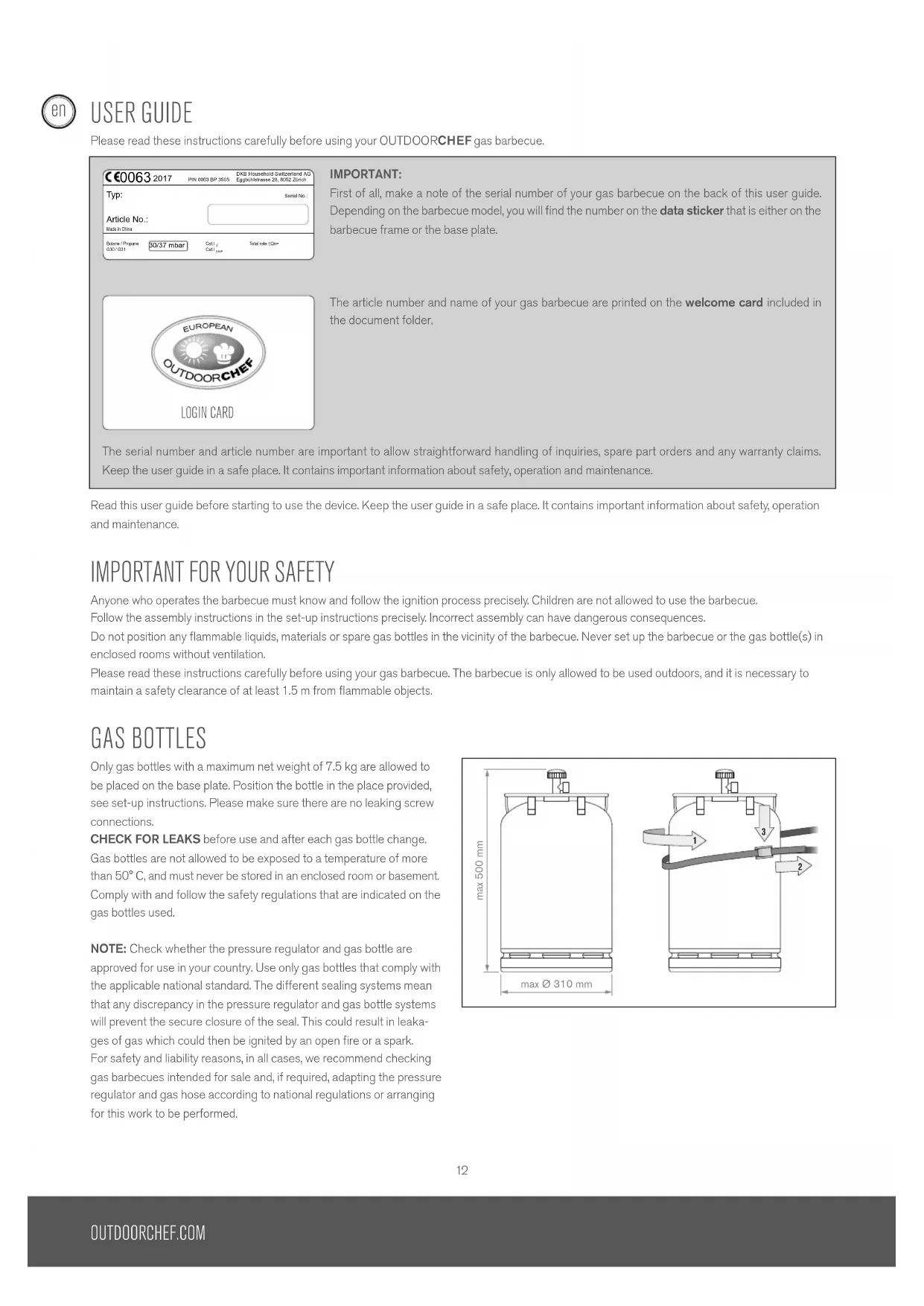 USER GUIDE Please read these instructions carefully before using your OUTDOORCHEF gas barbecue. Read this user guide before starting to use the device. Keep the user guide in a safe place. It contains important information about safety, operation and maintenance.