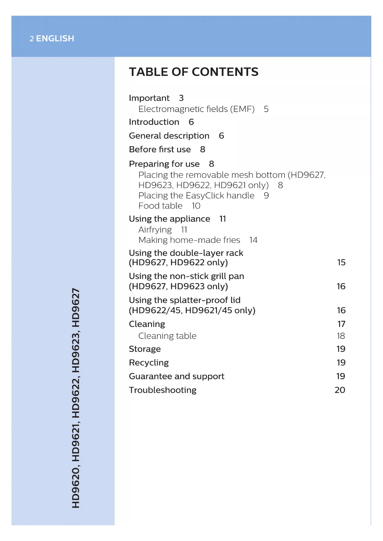 Important 3 Electromagnetic elds (EMF) 5 Introduction 6 General description 6 Before rst use 8 Preparing for use 8 Placing the removable mesh bottom (HD9627, HD9623, HD9622, HD9621 only) 8 Placing the EasyClick handle 9 Food table 10 Using the appliance 11 Airfrying 11 Making home-made fries 14 Using the double-layer rack (HD9627, HD9622 only) 15 Using the non-stick grill pan (HD9627, HD9623 only) 16 Using the splatter-proof lid (HD9622/45, HD9621/45 only) 16 Cleaning 17 Cleaning table 18 Storage 19 Recycling 19 Guarantee and support 19 Troubleshooting 203ENGLISH Important Read this important information carefully before you use the appliance and save it for future reference. Danger - Always put the ingredients to be fried in the basket, to prevent them from coming into contact with the heating elements. - Do not cover the air inlet and the air outlet openings while the appliance is operating. - Do not ll the pan with oil as this may cause a re hazard. - Never immerse the appliance in water or any other liquid, nor rinse it under the tap. Warning - Check if the voltage indicated on the appliance corresponds to the local mains voltage before you connect the appliance. - Do not use the appliance if the plug, the power cord or the appliance itself is damaged. - If the power cord is damaged, you must have it replaced by Philips, a service center authorised by Philips or similarly qualied persons in order to avoid a hazard. - This appliance can be used by children aged from 8 years and above and persons with reduced physical, sensory or mental capabilities or lack of experience and knowledge if they have been given supervision or instruction concerning use of the appliance in a safe way and understand the hazards involved. Children shall not play with the appliance. Cleaning and user maintenance shall not be made by children unless they are older than 8 years and supervised. - Keep the appliance and its cord out of reach of children less than 8 years. - Keep the power cord away from hot surfaces.4 ENGLISH - Only connect the appliance to an earthed wall outlet. Always make sure that the plug is inserted into the wall outlet properly. - Always place and use the appliance on a dry, stable, level and horizontal surface. - This appliance is not intended to be operated by means of an external timer or a separate remote-control system. - Do not place the appliance against a wall or against other appliances. Leave at least 10cm free space on the back and sides and 10cm free space above the appliance. Do not place anything on top of the appliance. - Do not use the appliance for any other purpose than described in the user manual. - During hot airfrying, hot steam is released through the air outlet openings. Keep your hands and face at a safe distance from the steam and from the air outlet openings. Also be careful of hot steam and air when you remove the pan from the appliance. - The accessible surfaces may become hot during use. - The Airfryer accessories become hot when you use them in the Airfryer. Be careful when you handle them. Caution - This appliance is intended for normal household use only. It is not intended for use in environments such as sta kitchens of shops, oces, farms or other work environments. Nor is it intended to be used by clients in hotels, motels, bed and breakfasts and other residential environments. - Always return the appliance to a service centre authorised by Philips for5ENGLISH examination or repair. Do not attempt to repair the appliance yourself, otherwise the guarantee becomes invalid. - Let the basket and non-stick grill pan (HD9627, HD9623 only) cool down before you exchange or remove the EasyClick handle. - This appliance is designed to be used at ambient temperatures between 5°C and 40°C. - Always unplug the appliance after use. - Let the appliance cool down for approx. 30 minutes before you handle or clean it. - Do not overll the basket. Only ll the basket to the MAX indication. - Make sure the ingredients prepared in this appliance come out golden-yellow instead of dark or brown. Remove burnt remnants. Do not fry fresh potatoes at a temperature above 180°C (to minimise the production of acrylamide). - After having removed the pan with the basket from the appliance, please put the pan with the basket on a suitable surface and let it rest for at least 30 seconds before removing the basket from the pan. - Be careful when cleaning the upper area of the cooking chamber: Hot heating element, edge of Metal parts. - Do not use the appliance for any other purpose than described in the user manual and use only original accessories. Electromagnetic elds (EMF) This Philips appliance complies with all applicable standards and regulations regarding electromagnetic elds.6 ENGLISH Introduction Congratulations on your purchase and welcome to Philips! To fully benet from the support that Philips oers, register your product at www.philips.com/welcome. Your new Airfryer allows you to prepare your favorite ingredients and snacks in a healthier way. The Airfryer uses hot air in combination with high-speed air circulation (TurboStar rapid air technology) and a top grill to prepare a variety of tasty dishes in a healthy, fast and easy way. Your ingredients are heated from all sides at once and there is no need to add oil to most of the ingredients. For more inspiration, recipes and information about the Airfryer, visit www.philips.com/kitchen or download the free Airfryer App for IOS® or Android™. General description 1 Timer/power-on knob 2 Heating-up light 3 Air inlet 4 Pan 5 Temperature control knob 6 Air outlets 7 Cord storage wrap 8 Power cord 9 Splatter-proof lid (HD9622/45, HD9621/45 only) 10 Double-layer rack (HD9627, HD9622 only) 11 Basket with xed mesh bottom (HD9620 only) 12 MAX indication 13 Basket release button 14 EasyClick handle 15 Basket with removable mesh bottom (HD9627, HD9623, HD9622, HD9621 only) 16 Removable mesh bottom (HD9627, HD9623, HD9622, HD9621 only) 1