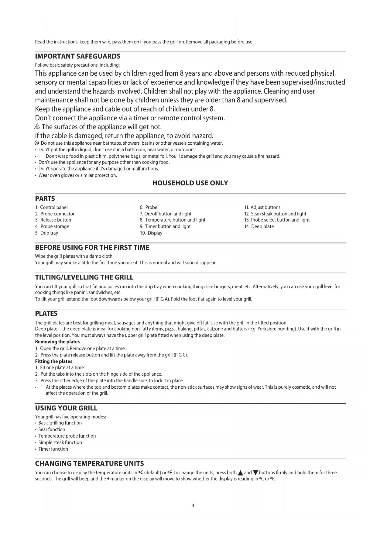 Read the instructions, keep them safe, pass them on if you pass the grill on. Remove all packaging before use. IMPORTANT SAFEGUARDS Follow basic safety precautions, including: This appliance can be used by children aged from 8 years and above and persons with reduced physical, sensory or mental capabilities or lack of experience and knowledge if they have been supervised/instructed and understand the hazards involved. Children shall not play with the appliance. Cleaning and user maintenance shall not be done by children unless they are older than 8 and supervised. Keep the appliance and cable out of reach of children under 8. Don’t connect the appliance via a timer or remote control system. ¬ The surfaces of the appliance will get hot. If the cable is damaged, return the appliance, to avoid hazard. b Do not use this appliance near bathtubs, showers, basins or other vessels containing water.