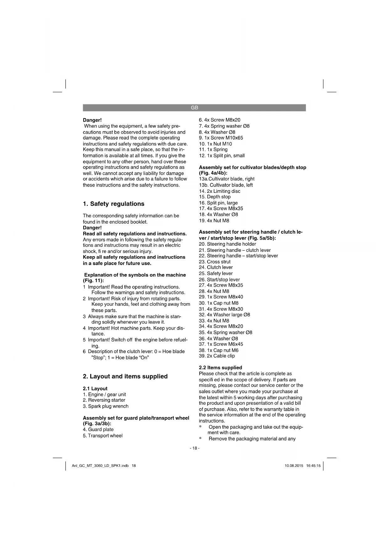 The corresponding safety information can be found in the enclosed booklet. Danger! Read all safety regulations and instructions. Any errors made in following the safety regula- tions and instructions may result in an electric shock, fi re and/or serious injury. Keep all safety regulations and instructions in a safe place for future use. Explanation of the symbols on the machine (Fig. 11): 1 Important! Read the operating instructions. Follow the warnings and safety instructions. 2 Important! Risk of injury from rotating parts. Keep your hands, feet and clothing away from these parts. 3 Always make sure that the machine is stan- ding solidly whenever you leave it. 4 Important! Hot machine parts. Keep your dis- tance. 5 Important! Switch off the engine before refuel- ing. 6 Description of the clutch lever: 0 = Hoe blade ”Stop”; 1 = Hoe blade “On”