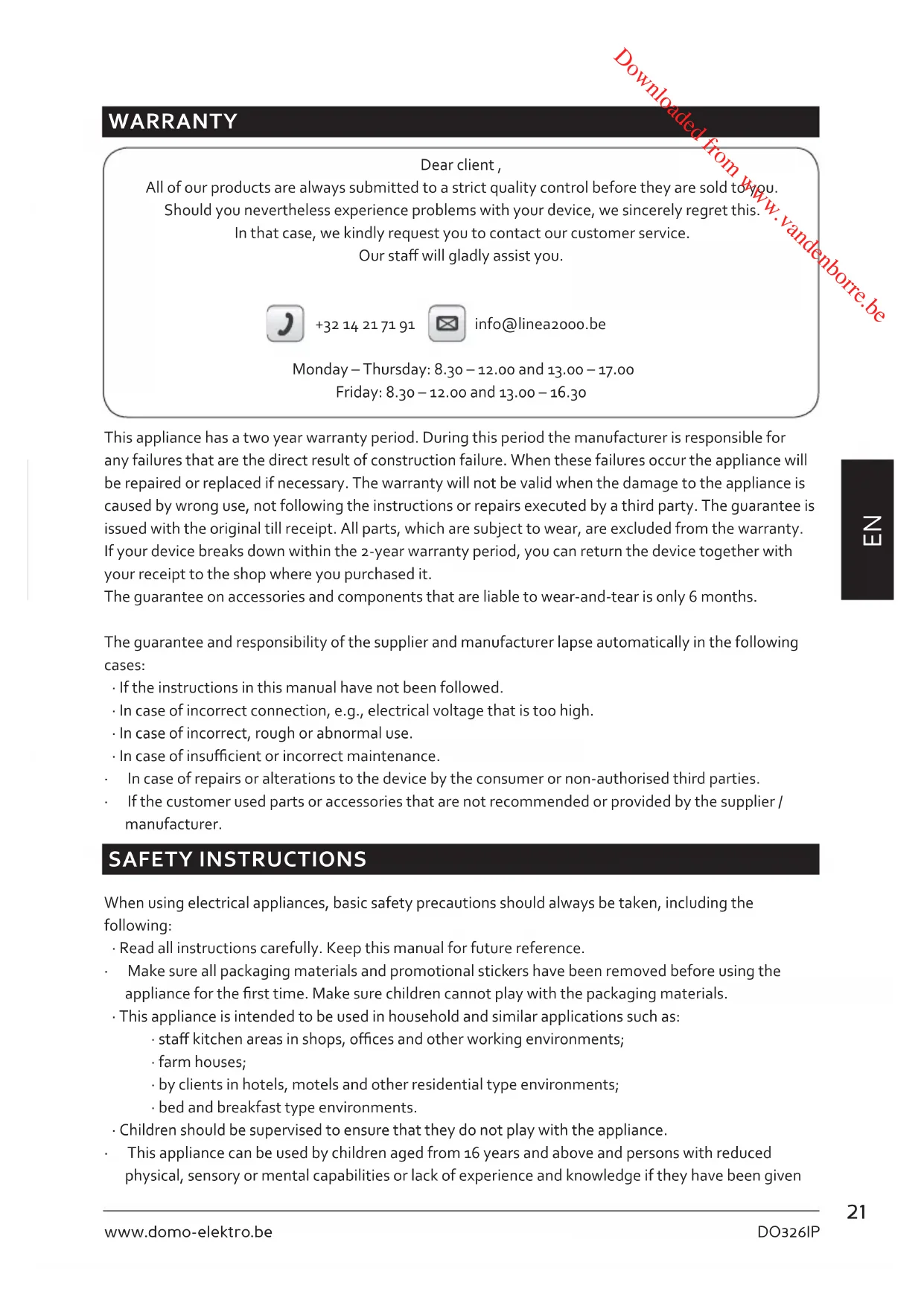 This appliance has a two year warranty period. During this period the manufacturer is responsible for any failures that are the direct result of construction failure. When these failures occur the appliance will be repaired or replaced if necessary. The warranty will not be valid when the damage to the appliance is caused by wrong use, not following the instructions or repairs executed by a third party. The guarantee is issued with the original till receipt. All parts, which are subject to wear, are excluded from the warranty. If your device breaks down within the 2-year warranty period, you can return the device together with your receipt to the shop where you purchased it.