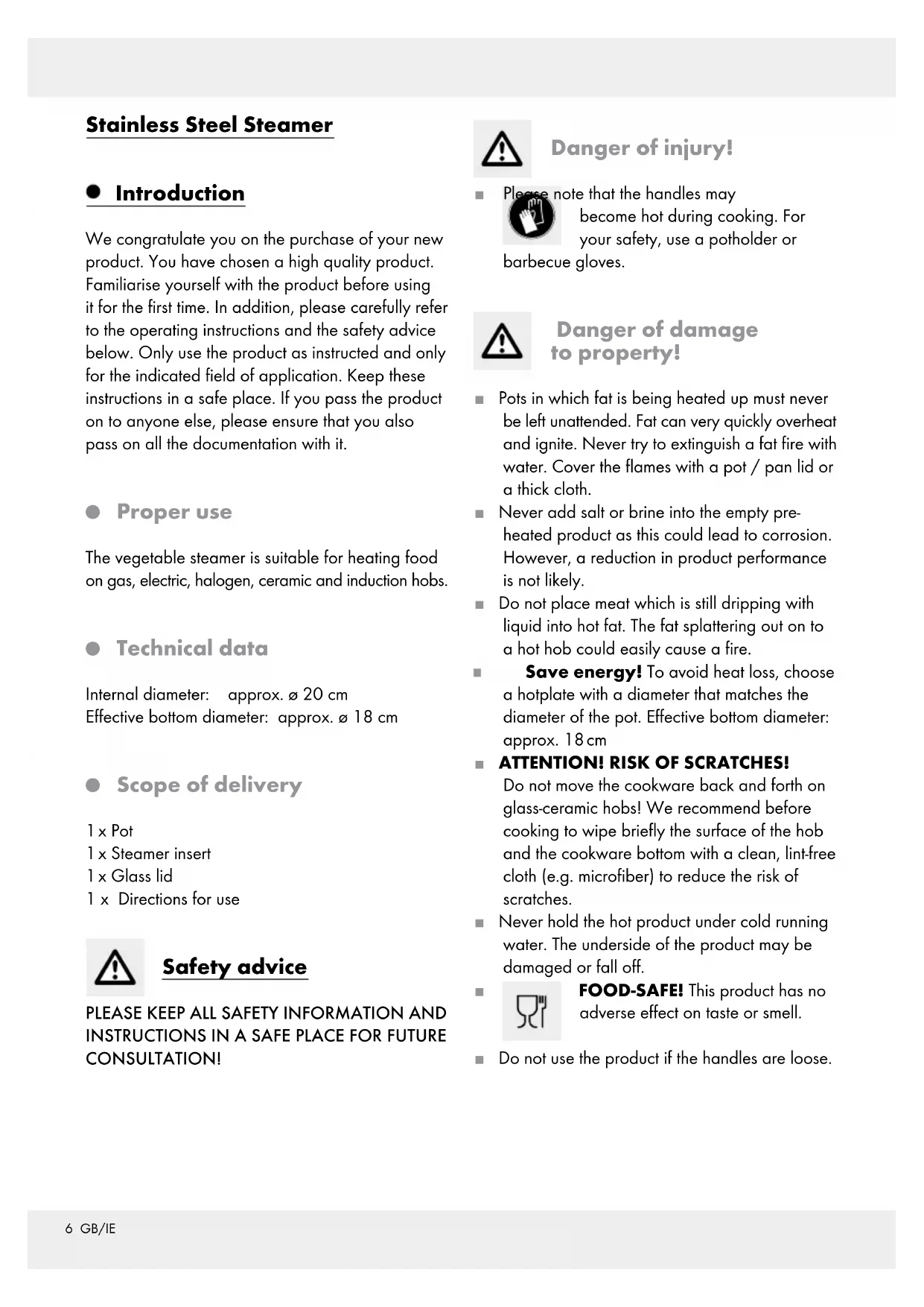 Cleaning and care j This pot is suitable for dishwasher. The glass lid is suitable for dishwasher. Attention! Fragile / not impact- resistant! j For washing the pot by hand, use hot water with a little ordinary washing-up liquid. Avoid using sharp or pointed objects for this in order not to damage the product. j Do not use harsh scouring agents. j In time, the minerals in the water could give rise to stains or discolorations on the product. You can get rid of them by rubbing half a lemon over them. More stubborn stains can be removed with a mixture of nine parts water to one part vinegar essence. Disposal The packaging is made entirely of recyclable mate- rials, which you may dispose of at local recycling facilities. Contact your local refuse disposal authority for more details of how to dispose of your worn-out product. Warranty The product has been manufactured to strict quality guidelines and meticulously examined before deli- very. In the event of product defects you have legal rights against the retailer of this product. Your legal rights are not limited in any way by our warranty detailed below. The warranty for this product is 3 years from the date of purchase. Should this product show any fault in materials or manufacture within 3 years from the date of purchase, we will repair or re- place it – at our choice – free of charge to you. The warranty period begins on the date of purchase. Please keep the original sales receipt in8 GB/IE a safe location. This document is required as your proof of purchase. This warranty becomes void if the product has been damaged, or used or maintained improperly. The warranty applies to defects in material or ma- nufacture. This warranty does not cover product p arts subject to normal wear, thus possibly considered consumables (e.g. batteries) or for damage to fra- gile parts, e.g. switches, rechargeable batteries or glass parts. Warranty claim procedure To ensure quick processing of your case, please observe the following instructions: Please have the till receipt and the item number (e.g. IAN 123456_7890) available as proof of purchase. You will find the item number on the type plate, an engraving on the front page of the instructions (bot- tom left), or as a sticker on the rear or bottom of the appliance. If functional or other defects occur, please contact the service department listed either by telephone or by e-mail. You can return a defective product to us free of charge to the service address that will be provided to you. Ensure that you enclose the proof of pur- chase (till receipt) and information about what the defect is and when it occurred. Service Service Great Britain Tel.: 0800 404 7657 E-Mail: owim@lidl.co.uk Service Ireland Tel.: 1890 930 034 (0,08 EUR / Min., (peak)) (0,06 EUR / Min., (off peak)) E-Mail: owim@lidl.ie9 FR/BE Cuiseur vapeur en acier inoxydable Introduction Nous vous félicitons pour l‘achat de votre nouveau produit. Vous avez opté pour un produit de grande qualité. Avant la première mise en service, vous devez vous familiariser avec toutes les fonctions du produit. Veuillez lire attentivement le mode d’emploi ci-des- sous et les consignes de sécurité. N’utilisez le produit que pour l’usage décrit et les domaines d’application cités. Conserver ces instructions dans un lieu sûr. Si vous donnez le produit à des tiers, remettez-leur également la totalité des documents.