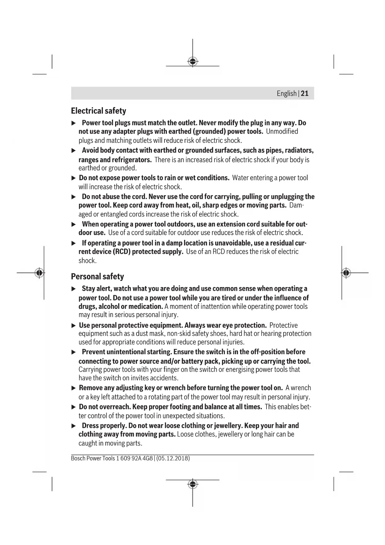 The vibration level and noise emission value given in these instructions have been meas- ured in accordance with a standardised measuring procedure and may be used to com- pare power tools. They may also be used for a preliminary estimation of vibration and noise emissions. The stated vibration level and noise emission value represent the main applications of the power tool. However, if the power tool is used for other applications, with different application tools or is poorly maintained, the vibration level and noise emission value may differ. This may significantly increase the vibration and noise emissions over the total working period. To estimate vibration and noise emissions accurately, the times when the tool is switched off or when it is running but not actually being used should also be taken into account. This may significantly reduce vibration and noise emissions over the total work- ing period. Implement additional safety measures to protect the operator from the effects of vibra- tion, such as servicing the power tool and application tools, keeping their hands warm, and organising workflows correctly. Fitting u Remove the battery before cleaning or performing maintenance work on the power tool, before making tool adjustments, changing accessories or storing the power tool. This safety measure prevents the power tool from being started accident- ally. Battery Charging (see figure C) u Use only the power adaptor listed in the technical data. Only this power adaptor is compatible with your power tool's lithium-ion battery. Note: The battery is supplied partially charged. To ensure the maximum performance of the battery, use the power adaptor to fully charge the battery before first use. The lithium-ion battery can be charged at any time without reducing its service life. Inter- rupting the charging process does not damage the battery. Bosch Power Tools 1 609 92A 4G8 | (05.12.2018)28 | English The lithium-ion battery is protected against deep discharge by the Electronic Cell Protec- tion (ECP). When the battery is discharged, the power tool is switched off by means of a protective circuit: The application tool stops moving. u Do not continue to press the On/Off switch after the power tool has automatic- ally switched off. The battery can be damaged. The battery features NTC temperature monitoring, which only permits charging in a tem- perature range between 10 °C and 35 °C. This achieves a long battery life. You can charge the battery (5) separately or in the power tool. – Open the cover (8). – Connect the battery (5) to the power adaptor (10) using a USB cable (11). – Plug the power adaptor (10) into the plug socket. The charging process begins. The battery charge indicator (6) indicates the charging progress. During the charging process, the power tool is deactivated and cannot be used. If you are not planning to use the power tool again soon, disconnect the power adaptor (10) from the mains. Inserting and removing the battery (see figure A) u Do not use force to insert the battery. The battery is designed in such a way that it can only be inserted into the power tool when it is in the right position. – Slide the battery (5) all the way into the battery bay (12). – To remove the battery (5), press the release buttons (13) on the battery and pull it out of the battery bay (12). Follow the instructions on correct disposal. Battery charge indicator The battery charge indicator (6) is automatically activated when the battery (5) is moved. The battery charge indicator (6) goes out if the battery (5) is not moved for a few seconds. The battery charge indicator (6) is switched off when the power tool is being used. Charging Battery separate or in the power tool (in motion) Charging process (battery with connected power adaptor) 100% Green (continuous) Green (continuous) 1 609 92A 4G8 | (05.12.2018) Bosch Power ToolsEnglish | 29 Charging Battery separate or in the power tool (in motion) Charging process (battery with connected power adaptor) 100% − 50% Green (continuous) Green (flashing) 50% − 20% Yellow (continuous) Green (flashing) 20% − 5% Red (continuous) Green (flashing) 5% − 0% Red (flashing) Green (flashing) Note: If the battery (5) has been stored away and has not been used for a long period of time, it is possible that the battery charge indicator (6) will not be activated. This pro- tects the battery (5) from deep discharge. Once the battery (5) is charged, the indicator will be activated again. In this case, the charging time may increase. The battery charge indicator (6) goes out a few minutes after the battery (5) has been fully charged. Note: If the battery charge indicator (6) is flashing white, the temperature is outside the permitted ambient temperature range. The charging process begins automatically once the permitted temperature range has been reached again. The battery charge indicator (6) will flash green during the charging process. Changing the tool (see figure B) Open the keyless chuck (2) by turning it in the direction of rotation ➋ until the tool can be inserted. Insert the tool. Firmly tighten the keyless chuck (2) by turning it by hand in the direction of rotation ➊. Dust/Chip Extraction Dust from materials such as lead-containing coatings, some wood types, minerals and metal can be harmful to one’s health. Touching or breathing-in the dust can cause allergic reactions and/or lead to respiratory infections of the user or bystanders. Certain dust, such as oak or beech dust, is considered carcinogenic, especially in con- nection with wood-treatment additives (chromate, wood preservative). Materials con- taining asbestos may only be worked by specialists. – Provide for good ventilation of the working place. – It is recommended to wear a P2 filter-class respirator. Bosch Power Tools 1 609 92A 4G8 | (05.12.2018)30 | English Observe the relevant regulations in your country for the materials to be worked. u Avoid dust accumulation a