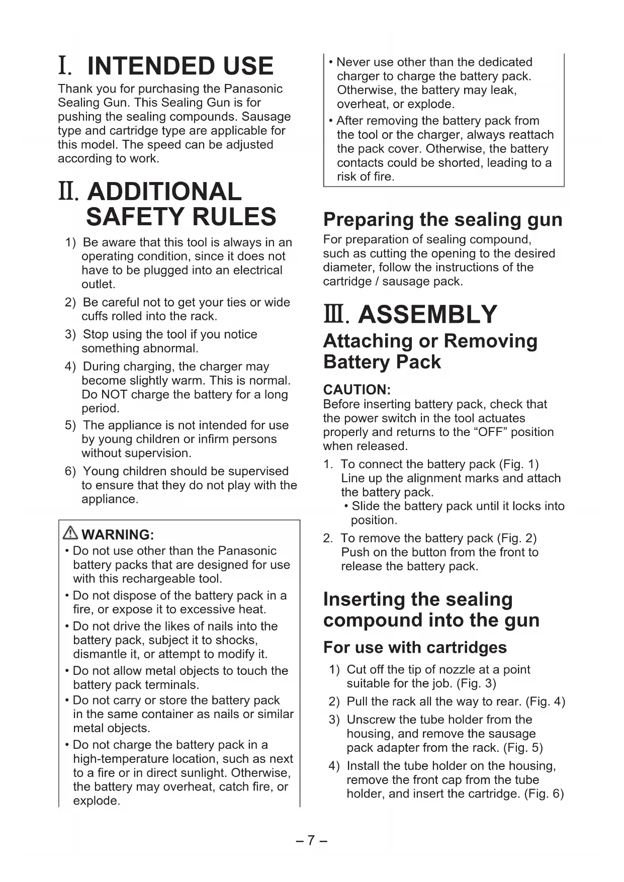 - Do not use other than the Panasonic battery packs that are designed for use with this rechargeable tool.• Do not dispose of the battery pack in a fire, or expose it to excessive heat.• Do not drive the likes of nails into the battery pack, subject it to shocks, dismantle it, or attempt to modify it.• Do not allow metal objects to touch the battery pack terminals.• Do not carry or store the battery pack in the same container as nails or similar metal objects.• Do not charge the battery pack in a high-temperature location, such as next to a fire or in direct sunlight. Otherwise, the battery may overheat, catch fire, or explode.• Never use other than the dedicated charger to charge the battery pack. Otherwise, the battery may leak, overheat, or explode.• After removing the battery pack from the tool or the charger, always reattach the pack cover. Otherwise, the battery contacts could be shorted, leading to a risk of fire. Preparing the sealing gun For preparation of sealing compound, such as cutting the opening to the desired diameter, follow the instructions of the cartridge / sausage pack. III . ASSEMBLY Attaching or Removing Battery Pack CAUTION: Before inserting battery pack, check that the power switch in the tool actuates properly and returns to the “OFF” position when released.1. To connect the battery pack (Fig. 1) Line up the alignment marks and attach the battery pack.• Slide the battery pack until it locks into position.2. To remove the battery pack (Fig. 2) Push on the button from the front to release the battery pack. Inserting the sealing compound into the gun For use with cartridges 1) Cut off the tip of nozzle at a point suitable for the job. (Fig. 3)2) Pull the rack all the way to rear. (Fig. 4)3) Unscrew the tube holder from the housing, and remove the sausage pack adapter from the rack. (Fig. 5)4) Install the tube holder on the housing, remove the front cap from the tube holder, and insert the cartridge. (Fig. 6)-