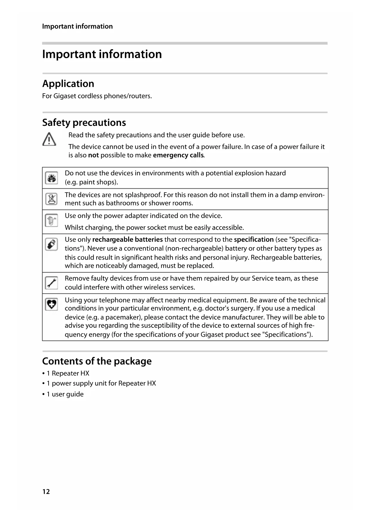 - 1 user guide Read the safety precautions and the user guide before use. The device cannot be used in the event of a power failure. In case of a power failure it is also not possible to make emergency calls. Do not use the devices in environments with a potential explosion hazard (e.g. paint shops). The devices are not splashproof. For this reason do not install them in a damp environ- ment such as bathrooms or shower rooms. Use only the power adapter indicated on the device. Whilst charging, the power socket must be easily accessible. Use only rechargeable batteries that correspond to the specification (see "Specifica- tions"). Never use a conventional (non-rechargeable) battery or other battery types as this could result in significant health risks and personal injury. Rechargeable batteries, which are noticeably damaged, must be replaced. Remove faulty devices from use or have them repaired by our Service team, as these could interfere with other wireless services. Using your telephone may affect nearby medical equipment. Be aware of the technical conditions in your particular environment, e.g. doctor's surgery. If you use a medical device (e.g. a pacemaker), please contact the device manufacturer. They will be able to advise you regarding the susceptibility of the device to external sources of high fre- quency energy (for the specifications of your Gigaset product see "Specifications").13 Repeater HX / ALL IM en / A31008-N603-R101-1-SU19 / Grep-eng_HX.fm / 3/28/19 Template Go, Version 1, 01.07.2014 / ModuleVersion 1.0 Introduction ENGLISH Introduction With the Gigaset Repeater, you can extend the range and reception strength of your base sta- tion. Up to 6 Gigaset Repeater units can be used with a single base station. The maximum num- ber depends on your base station and the type of DECT transmission (encrypted/unencrypted). A maximum of 2 conversations can be held at the same time within the extended reception range. The number of handsets that can be registered to your base station is not affected by the Gigaset Repeater. Features of the Repeater HX: