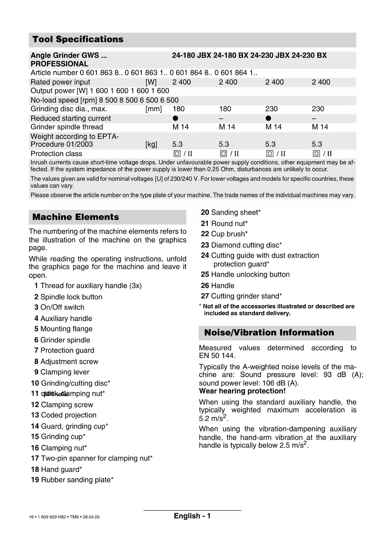 Tool Specifications Angle Grinder GWS ... PROFESSIONAL 24-180 JBX 24-180 BX 24-230 JBX 24-230 BX Article number 0 601 863 8.. 0 601 863 1.. 0 601 864 8.. 0 601 864 1.. Rated power input [W] 2 400 2 400 2 400 2 400 Output power [W] 1 600 1 600 1 600 1 600 No-load speed [rpm] 8 500 8 500 6 500 6 500 Grinding disc dia., max. [mm] 180 180 230 230 Reduced starting current ● – ● – Grinder spindle thread M 14 M 14 M 14 M 14 Weight according to EPTA- Procedure 01/2003 [kg] 5.3 5.3 5.3 5.3 Protection class / II / II / II / II Inrush currents cause short-time voltage drops. Under unfavourable power supply conditions, other equipment may be af- fected. If the system impedance of the power supply is lower than 0.25 Ohm, disturbances are unlikely to occur. The values given are valid for nominal voltages [U] of 230/240 V. For lower voltages and models for specific countries, these values can vary. Please observe the article number on the type plate of your machine. The trade names of the individual machines may vary. Machine Elements Noise/Vibration Information 1 609 929 H82.book Seite 1 Dienstag, 3. Mai 2005 3:11 15 16 • 1 609 929 H82 • TMS • 28.04.05English - 2 The machine is intended for cutting, roughing and brushing metal and stone materials without using water. For cutting stone, a cutting guide is re- quired. Slots in structural walls are subject to the Stand- ard DIN 1053, Part 1 or country-specific regula- tions. These regulations are to be observed under all circumstances. Before beginning work, consult the responsible structural engineer, architect or the construction supervisor. Read all instructions. Failure to fol- low all instructions listed below may result in electric shock, fire and/or se- rious injury. Additionally, the general safety instructions either in the enclosed booklet or those added in the centre of these operating instructions must be ob- served. SAVE THESE INSTRUCTIONS. Wear safety goggles. Wear hearing protection. ■ When working with the machine, always hold it firmly with both hands and provide for a secure stance. The power tool is guided more secure with both hands. ■ Secure the workpiece. A workpiece clamped with clamping devices or in a vice is held more securely than by hand. ■ Take protective measures when dust can develop during working that is harmful to one’s health, combustible or explosive. Ex- ample: Some dusts are regarded as carcino- genic. Work with dust/chip extraction and wear a dust mask. ■ Keep your workplace clean. Material mix- tures are particularly dangerous. Dust of light metal can be inflammable or explode. ■ Do not work materials containing asbes- tos. Asbestos is considered carcinogenic. ■ Do not use a machine with a damaged mains cable. Do not touch the damaged ca- ble and pull the mains plug when the cable is damaged while working. Damaged cables increase the risk of an electric shock. ■ Connect machines that are used in the open via a residual current device (RCD). Safety warnings that are common for grind- ing, sanding, wire brushing, polishing and abrasive cutting off operations: ■ This power tool is intended to function as a grinder, sander, wire brush, polisher or cut-off tool. Read all safety warnings, in- structions, illustrations and specifications provided with this power tool. Failure to fol- low all instructions listed below may result in electric shock, fire and/or serious injury. ■ Do not use accessories which are not spe- cifically designed and recommended by the tool manufacturer. Just because the ac- cessory can be attached to your power tool, it does not assure safe operation. ■ The rated speed of the accessory must be at least equal to the maximum speed marked on the power tool. Accessories run- ning faster than their rated speed can fly apart. ■ The outside diameter and the thickness of your accessory must be within the capacity rating of your power tool. Incorrectly sized accessories cannot be adequately guarded or controlled. ■ The arbour size of wheels, flanges, backing pads or any other accessory must properly fit the spindle of the power tool. Accessories with arbour holes that do not match the mount- ing hardware of the power tool will run out of balance, vibrate excessively and may cause loss of control. ■ Do not use a damaged accessory. Before each use inspect the accessory such as abrasive wheels for chips and cracks, backing pads for cracks, tear or excess wear, wire brushes for loose or cracked wires. If the power tool or accessory is dropped, inspect for damage or install an undamaged accessory. After inspecting and installing an accessory, position your- self and bystanders away from the plane of the rotating accessory and run the power tool at maximum no load speed for one minute. Damaged accessories will normally break apart during this test time. Intended Use Information on Structures For Your Safety 1 609 929 H82.book Seite 2 Dienstag, 3. Mai 2005 3:11 15 17 • 1 609 929 H82 • TMS • 28.04.05English - 3 ■ Wear personal protective equipment. De- pending on application, use face shield, safety goggles or safety glasses. As appro- priate, wear dust mask, hearing protectors, gloves and shop apron capable of stopping small abrasive or workpiece fragments. The eye protection must be capable of stop- ping flying debris generated by various opera- tions. The dust mask or respirator must be ca- pable of filtrating particles generated by your operation. Prolonged exposure to high inten- sity noise may cause hearing loss. ■ Keep bystanders a safe distance away from work area. Anyone entering the work area must wear personal protective equip- ment. Fragments of the workpiece or of a bro- ken accessory may fly away and cause injury beyond the immediate area of operation. ■ Hold the power tool only by the insulated gripping surfaces when performing an op- eration where the cutting tool may contact hidden wiring or its own power cord. Con- tact with a “live” wire w