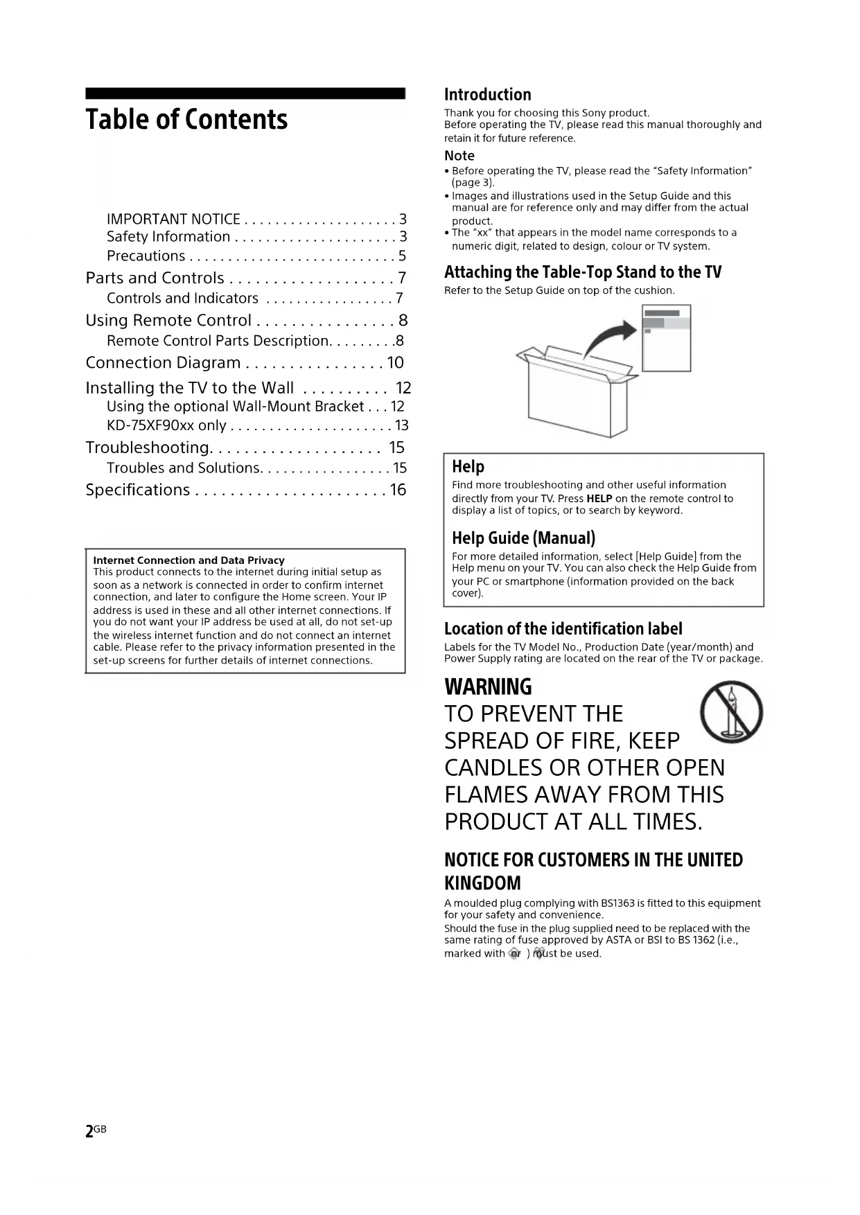 KINGDOM A moulded plug complying with BS1363 is fitted to this equipment for your safety and convenience.Should the fuse in the plug supplied need to be replaced with the same rating of fuse approved by ASTA or BSI to BS 1362 (i.e., marked with or ) must be used.Internet Connection and Data PrivacyThis product connects to the internet during initial setup as soon as a network is connected in order to confirm internet connection, and later to configure the Home screen. Your IP address is used in these and all other internet connections. If you do not want your IP address be used at all, do not set-up the wireless internet function and do not connect an internet cable. Please refer to the privacy information presented in the set-up screens for further details of internet connections. Help Find more troubleshooting and other useful information directly from your TV. Press HELP on the remote control to display a list of topics, or to search by keyword. Help Guide (Manual) For more detailed information, select [Help Guide] from the Help menu on your TV. You can also check the Help Guide from your PC or smartphone (information provided on the back cover).C:\Users\CHAILING_2\Desktop\CU\EU-2\01GB\4733119112_01GB.fm master page: Right KD-75XF90xx / 65XF90xx / 55XF90xx / 49XF90xx 4-733-119-11(2)