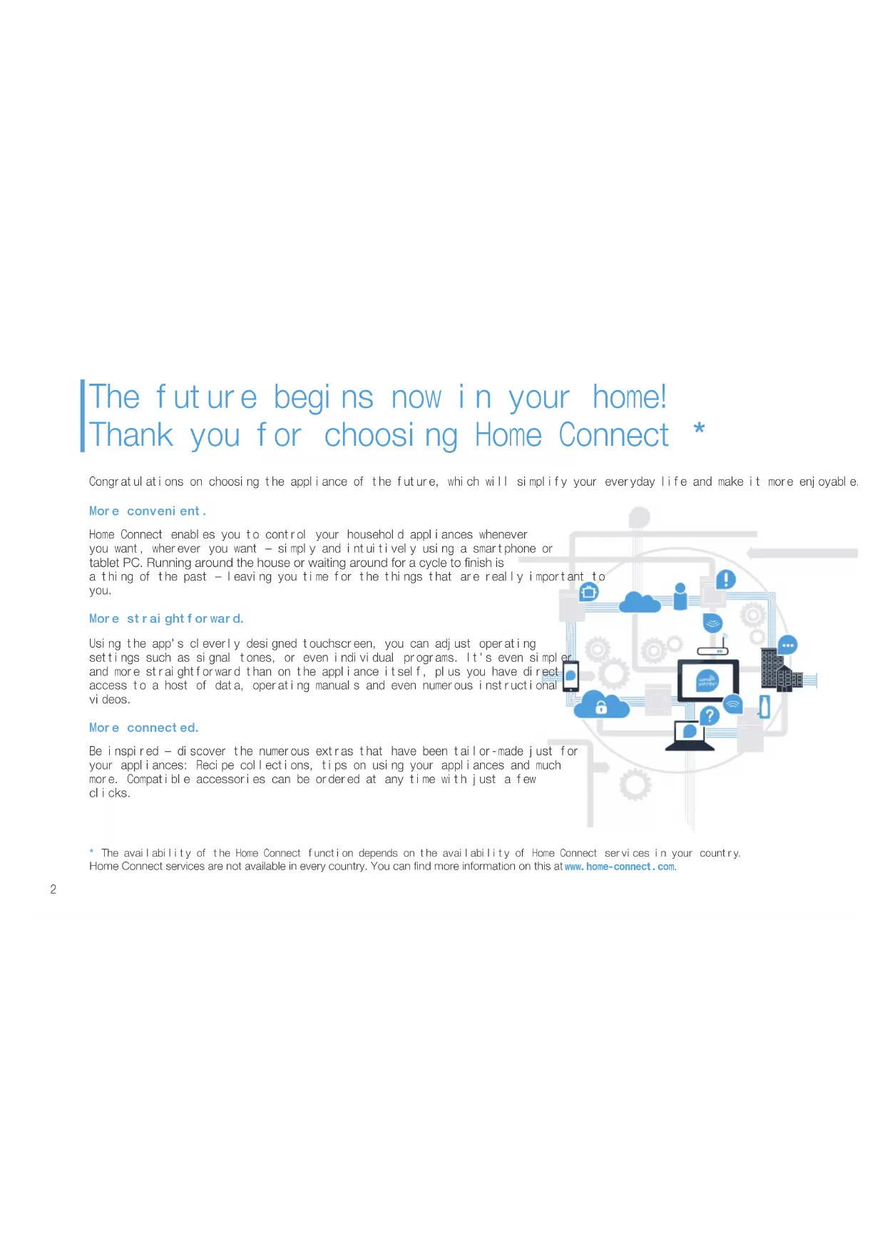 a thing of the past – leaving you time for the things that are really important to you. More straightforward. Using the app's cleverly designed touchscreen, you can adjust operating settings such as signal tones, or even individual programs. It's even simpler and more straightforward than on the appliance itself, plus you have direct access to a host of data, operating manuals and even numerous instructional videos. More connected. Be inspired – discover the numerous extras that have been tailor-made just for your appliances: Recipe collections, tips on using your appliances and much more. Compatible accessories can be ordered at any time with just a few clicks. The future begins now in your home! Thank you for choosing Home Connect *