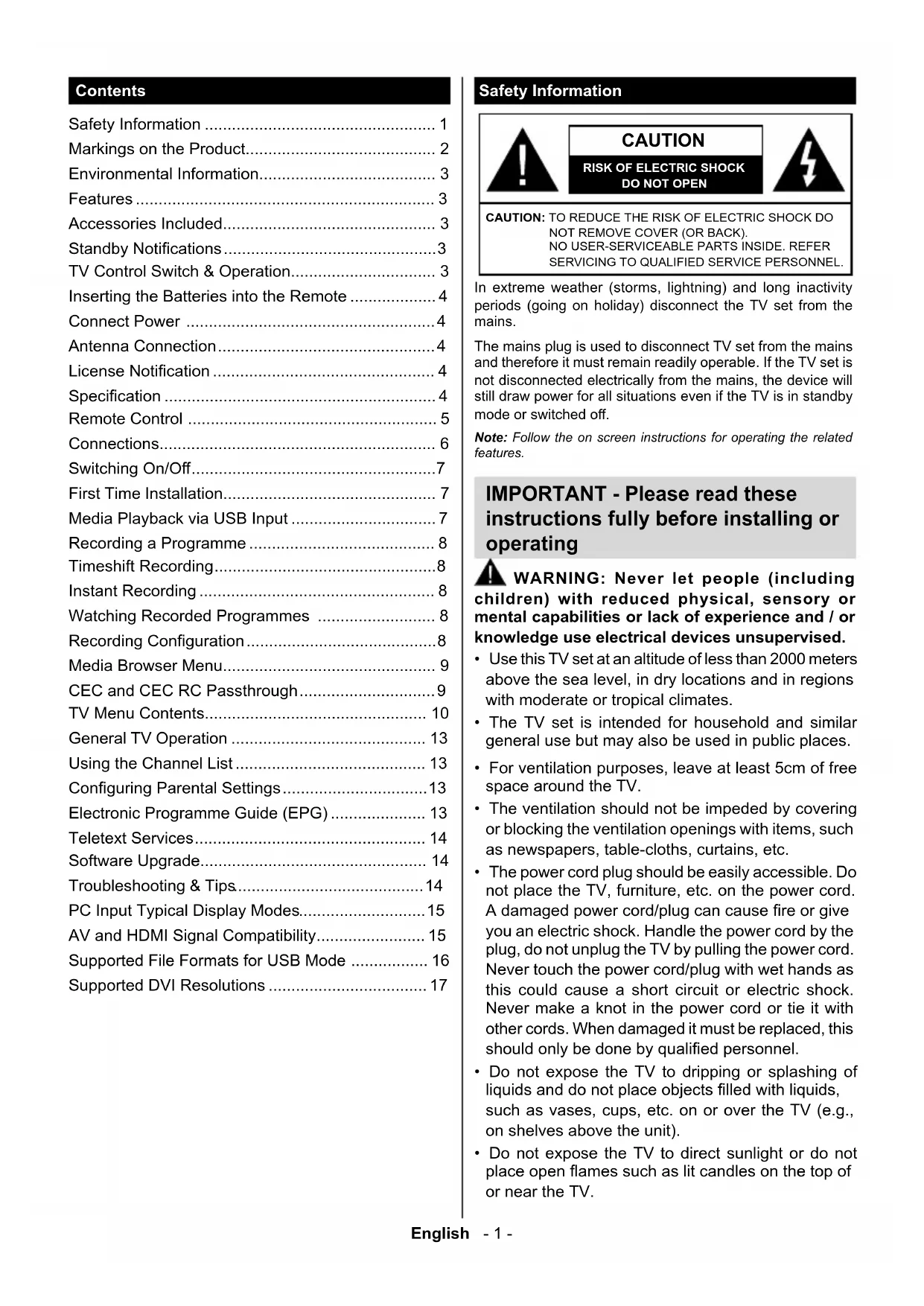 Resolução do visor (pixel) 1366x768English - 1 - Safety Information CAUTION RISK OF ELECTRIC SHOCKDO NOT OPENCAUTION: TO REDUCE THE RISK OF ELECTRIC SHOCK DO NOT REMOVE COVER (OR BACK). NO USER-SERVICEABLE PARTS INSIDE. REFER SER VICING TO QUALIFIED SERVICE PERSONNEL. Note: Follow the on screen instructions for operating the related features. In extreme weather (storms, lightning) and long inactivity periods (going on holiday) disconnect the TV set from the mains. The mains plug is used to disconnect TV set from the mains and therefore it must remain readily operable. If the TV set is not disconnected electrically from the mains, the device will still draw power for all situations even if the TV is in standby mode or switched o. IMPORTANT - Please read these instructions fully before installing or operating
