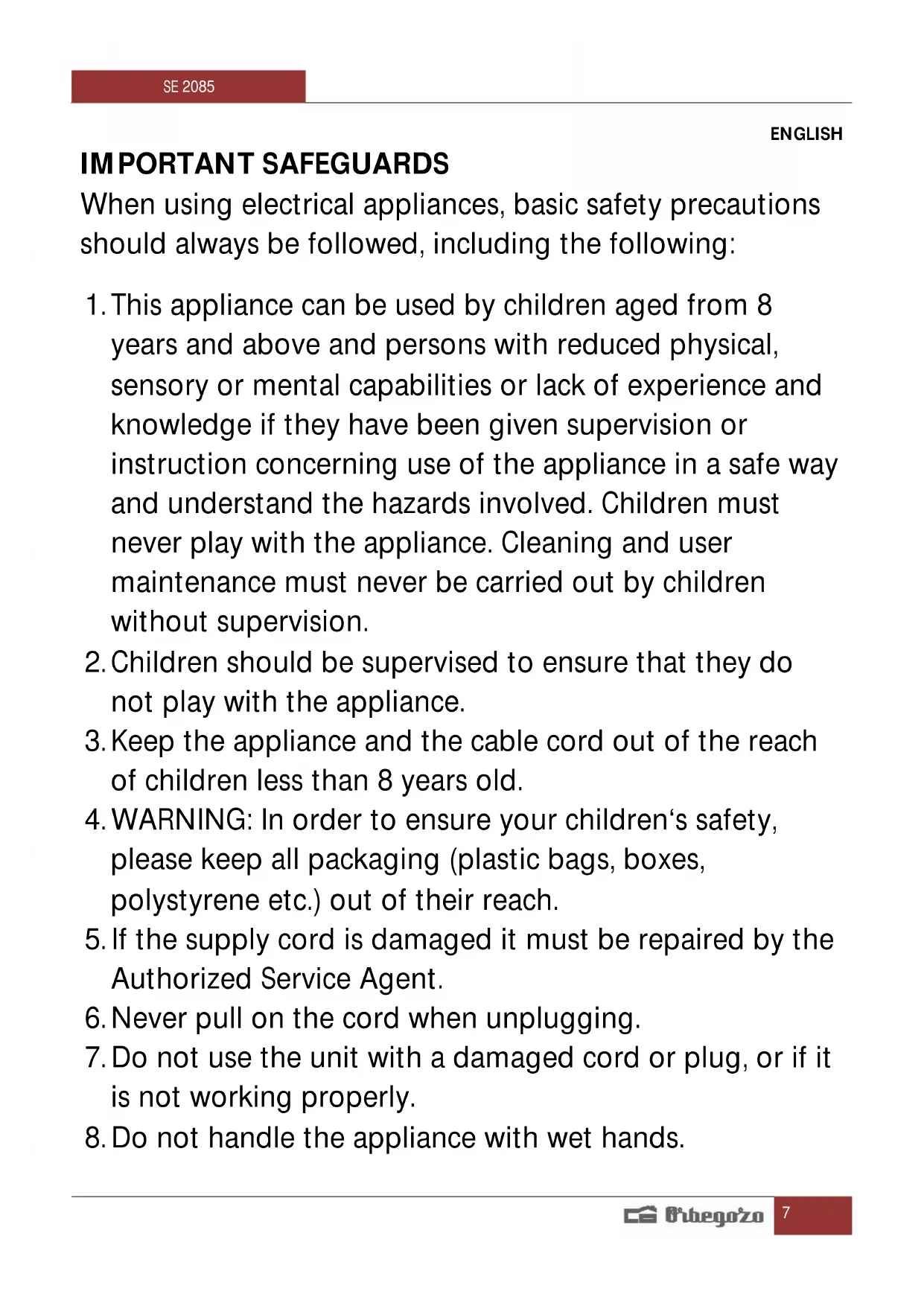 Find the device manual for free SE 2085 Orbegozo in PDF.