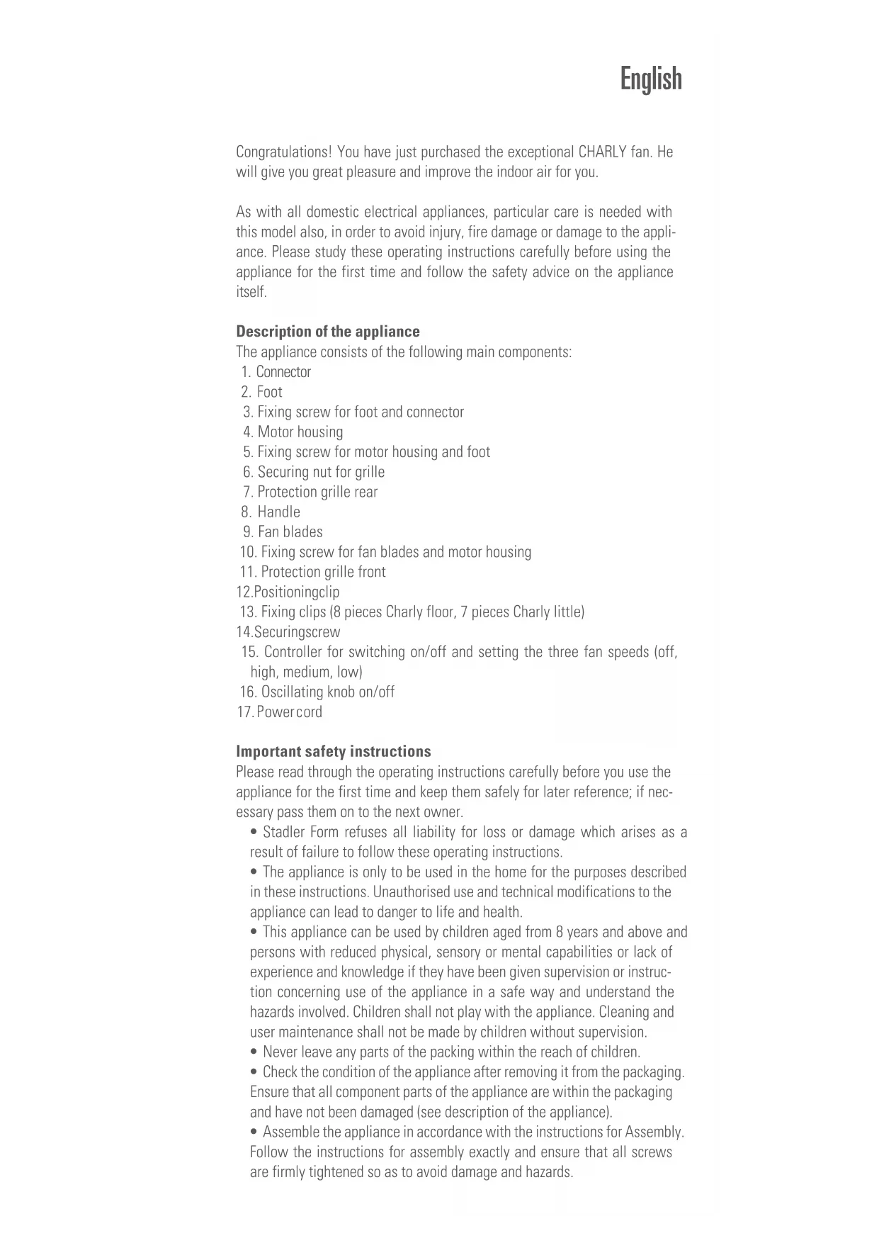 - Repairs to electrical appliances must only be carried out by a qualified electrical technician. Assembly (see page 2 and 3) Attention: The protection grille must be properly closed prior to switch- ing on the appliance so as to avoid any damage or hazards. Ensure that all screws and securing nuts are firmly tightened. Only connect the power cable to the socket once assembly has been completed. A. Remove fixing screw (3) on underside of connector (1). Insert connector (1) into foot (2) and secure with fixing screw for foot and connector (3). B. Undo fixing screw (5) on connector (1). Locate motor housing (4) on con- nector (1) and secure with fixing screw for motor housing and foot (5). C. Remove securing nut for grille (6) from motor housing (4) and locate pro- tection grille rear (7) on motor housing (4). When locating, ensure that the handle (8) on protection grille rear (7) is on the top. Now screw secur- ing nut for grille (6) back on to motor housing (4) so as to fix protection grille rear (7) in position. D. Attach fan blades (9) to motor housing (4) and secure in position with fixing screw for fan blades and motor housing (10) (loosely attached to fan blade). Tighten screw to secure fan blades (9). E. Locate protection grille front (11) on protection grille rear (7). In doing so, take care to ensure that positioning clip (12) on protection grille frontis fitted on protection grille rear as shown in illustration on page 2–3. Close the two grilles by fastening the 8 fixing clips (13) (or 7 in the case of Charly little). Ensure that all fixing clips (13) are fastened. F. Secure the two grilles (7 and 11) with securing screw (14). Setting up / operation