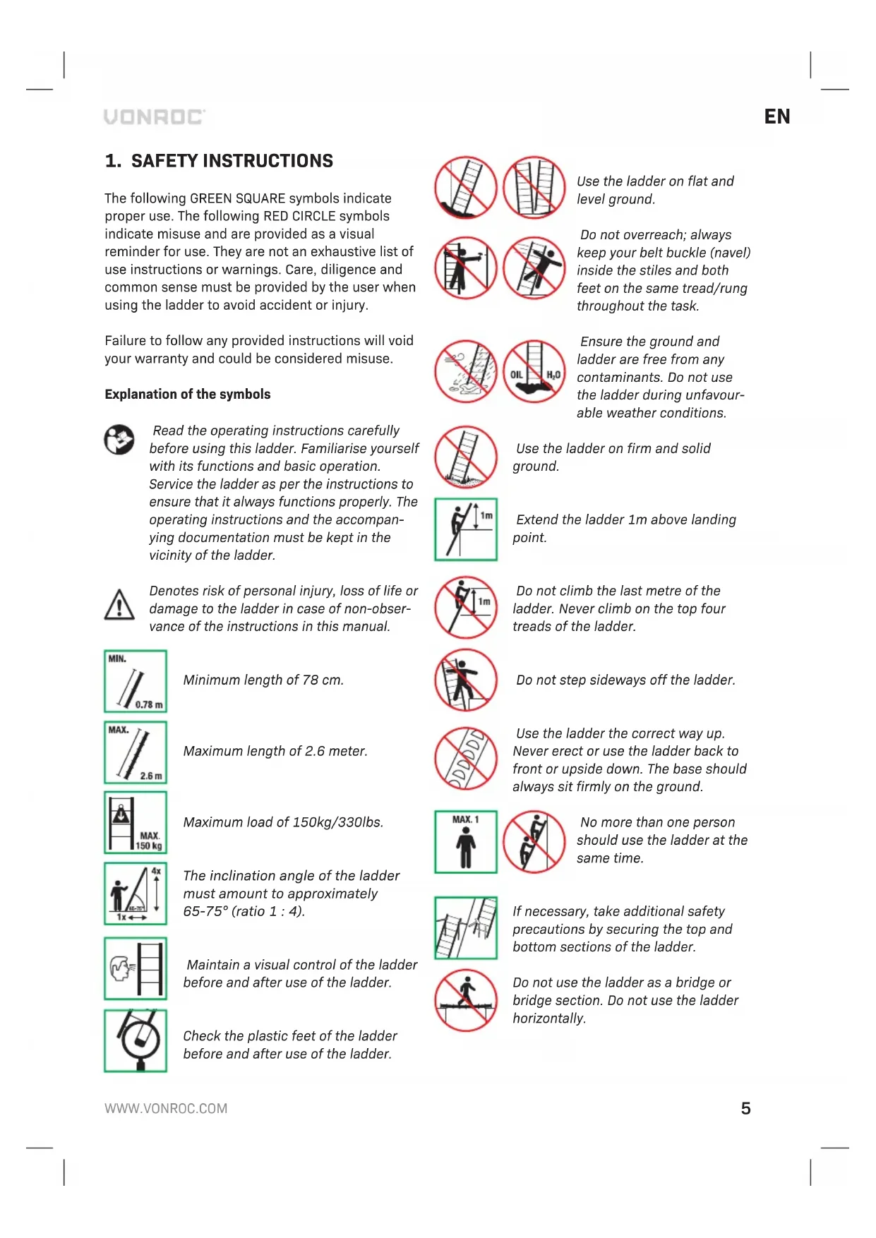 tering the ladder. Do not use the ladder without the plastic covers. Always maintain a visual control of the ladder before and after use of the ladder. Repairs and maintenance shall be carried out by a competent person with suitable replacement parts. Unapproved third party spares are not recom- mended and will void your warranty. WARRANTY VONROC products are developed to the highest quality standards and are guaranteed free of defects in both materials and workmanship for the period lawfully stipulated starting from the date of original purchase. Should the product develop any failure during this period due to defective material and/or workmanship then contact VONROC directly. The following circumstances are excluded from this guarantee: