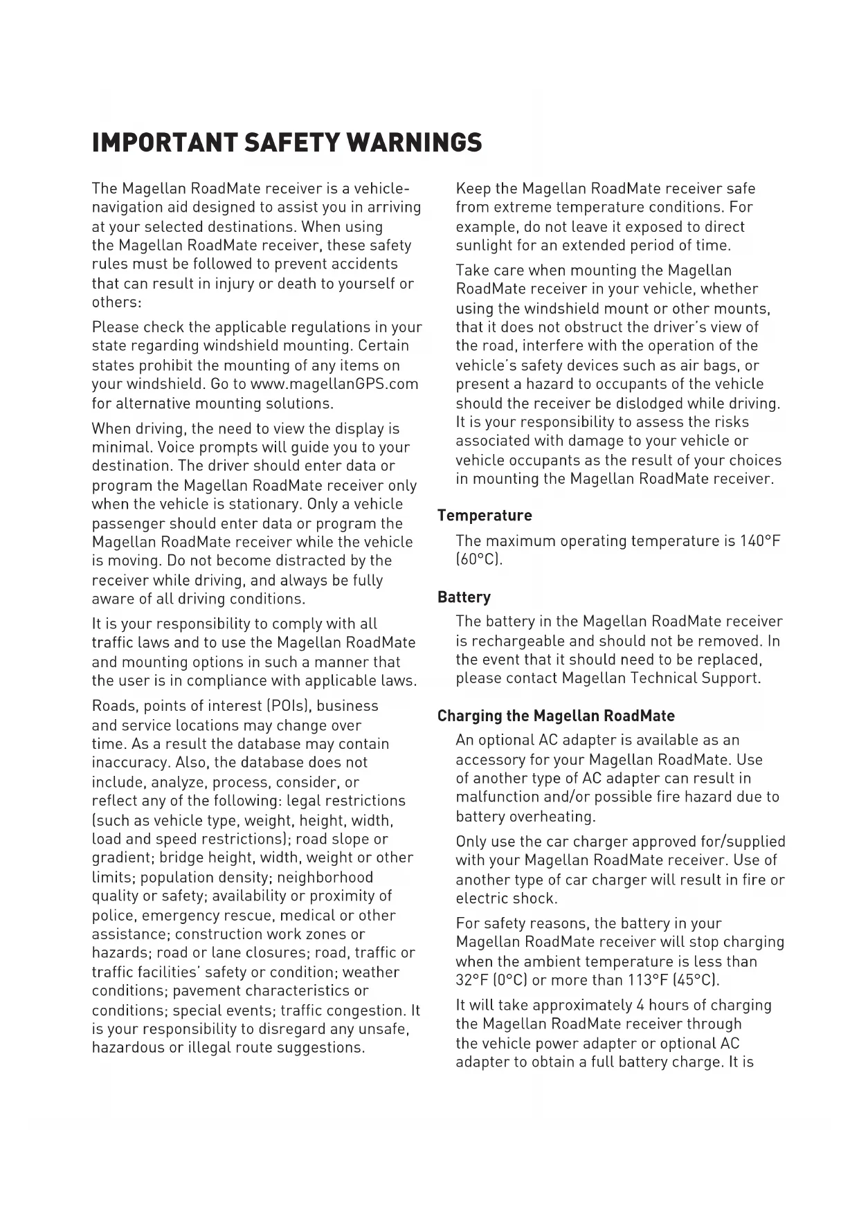 Keep the Magellan RoadMate receiver safe from extreme temperature conditions. For example, do not leave it exposed to direct sunlight for an extended period of time. Take care when mounting the Magellan RoadMate receiver in your vehicle, whether using the windshield mount or other mounts, that it does not obstruct the driver’s view of the road, interfere with the operation of the vehicle’s safety devices such as air bags, or present a hazard to occupants of the vehicle should the receiver be dislodged while driving. It is your responsibility to assess the risks associated with damage to your vehicle or vehicle occupants as the result of your choices in mounting the Magellan RoadMate receiver. Temperature The maximum operating temperature is 140°F (60°C). Battery The battery in the Magellan RoadMate receiver is rechargeable and should not be removed. In the event that it should need to be replaced, please contact Magellan Technical Support. Charging the Magellan RoadMate An optional AC adapter is available as an accessory for your Magellan RoadMate. Use of another type of AC adapter can result in malfunction and/or possible fire hazard due to battery overheating. Only use the car charger approved for/supplied with your Magellan RoadMate receiver. Use of another type of car charger will result in fire or electric shock. For safety reasons, the battery in your Magellan RoadMate receiver will stop charging when the ambient temperature is less than 32°F (0°C) or more than 113°F (45°C). It will take approximately 4 hours of charging the Magellan RoadMate receiver through the vehicle power adapter or optional AC adapter to obtain a full battery charge. It is The Magellan RoadMate receiver is a vehicle- navigation aid designed to assist you in arriving at your selected destinations. When using the Magellan RoadMate receiver, these safety rules must be followed to prevent accidents that can result in injury or death to yourself or others: Please check the applicable regulations in your state regarding windshield mounting. Certain states prohibit the mounting of any items on your windshield. Go to www.magellanGPS.com for alternative mounting solutions. When driving, the need to view the display is minimal. Voice prompts will guide you to your destination. The driver should enter data or program the Magellan RoadMate receiver only when the vehicle is stationary. Only a vehicle passenger should enter data or program the Magellan RoadMate receiver while the vehicle is moving. Do not become distracted by the receiver while driving, and always be fully aware of all driving conditions. It is your responsibility to comply with all traffic laws and to use the Magellan RoadMate and mounting options in such a manner that the user is in compliance with applicable laws. Roads, points of interest (POIs), business and service locations may change over time. As a result the database may contain inaccuracy. Also, the database does not include, analyze, process, consider, or reflect any of the following: legal restrictions (such as vehicle type, weight, height, width, load and speed restrictions); road slope or gradient; bridge height, width, weight or other limits; population density; neighborhood quality or safety; availability or proximity of police, emergency rescue, medical or other assistance; construction work zones or hazards; road or lane closures; road, traffic or traffic facilities’ safety or condition; weather conditions; pavement characteristics or conditions; special events; traffic congestion. It is your responsibility to disregard any unsafe, hazardous or illegal route suggestions.recommended that you charge the battery initially for at least 2 hours. Use only the charger approved for your Magellan RoadMate receiver. Estimated usage of the Magellan RoadMate on battery power is approximately 2 hours. Federal Communication Commission Interference Statement This equipment has been tested and found to comply with the limits for class B digital devices, in accordance with part 15 of the FCC Rules. These limits are designed to provide reasonable protection against harmful interference in a residential installation. This equipment generates, uses and can radiate radio frequency energy and, if not installed and used in accordance with the instructions, may cause harmful interference to radio communications. However, there is no guarantee that interference will not occur in a particular installation. If this equipment does cause harmful interference to radio or television reception, which can be determined by turning the equipment off and on, the user is encouraged to try to correct the interference by one of the following measures: Reorient or relocate the receiving antenna. Increase the separation between the equipment and receiver. Connect the equipment into an outlet on a circuit different from that to which the receiver is connected. Consult the dealer or an experienced radio/TV technician for help. This device complies with Part 15 of the FCC Rules. Operation is subject to the following two conditions: (1) This device may not cause harmful interference, and (2) this device must accept any interference received, including interference that may cause undesired operation. FCC Caution: Any changes or modifications not expressly approved by the party responsible for compliance could void the user’s authority to operate this equipment. IMPORTANT NOTE: FCC Radiation Exposure Statement: This equipment complies with FCC radiation exposure limits set forth for an uncontrolled environment. End users must follow the specific operating instructions for satisfying RF exposure compliance. This transmitter must not be co-located or operating in conjunction with any other antenna or transmitter. In order to maintain compliance with FCC regulations, shielded cables must be used with this equipment. Operation with non-approved equipment or unshielded cables is likely to result in interference to radio and 