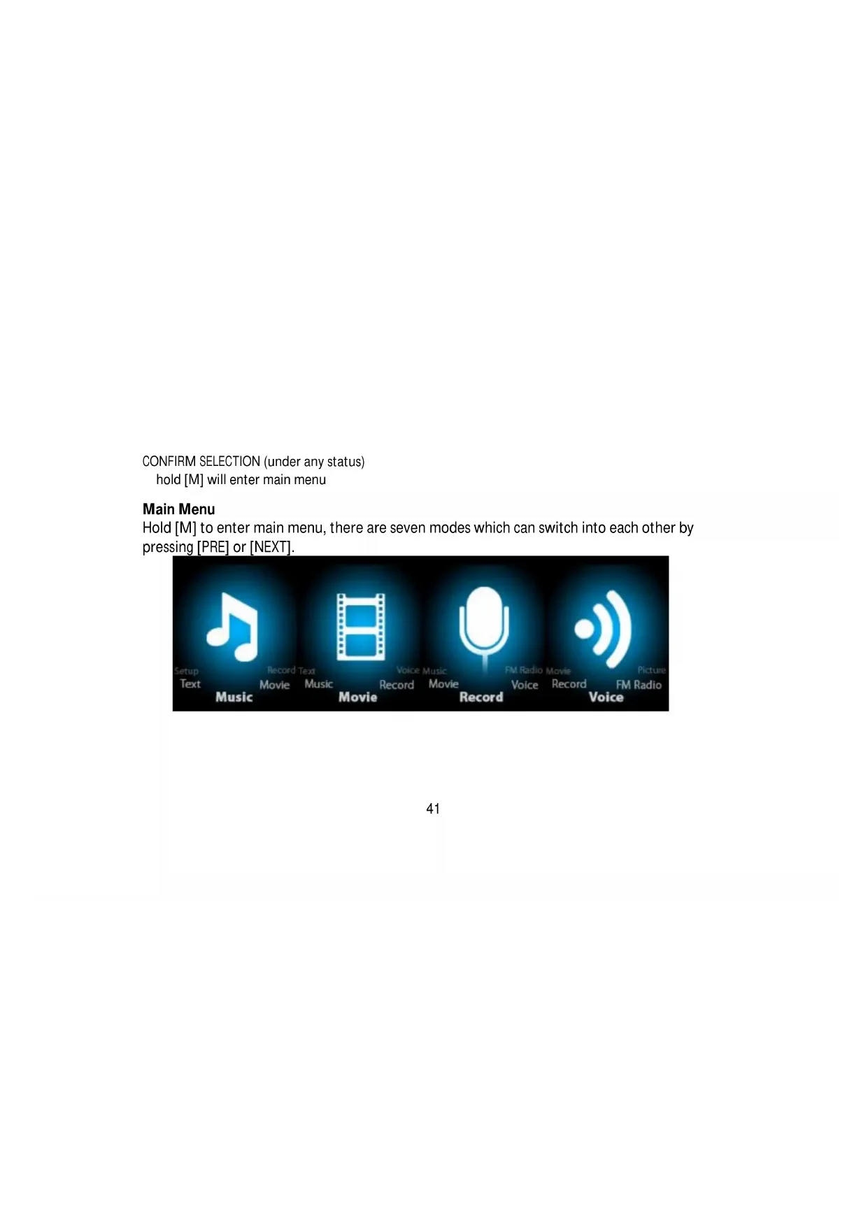 CONFIRM SELECTION (under any status) hold [M] will enter main menu Main Menu Hold [M] to enter main menu, there are seven modes which can switch into each other by pressing [PRE] or [NEXT].42