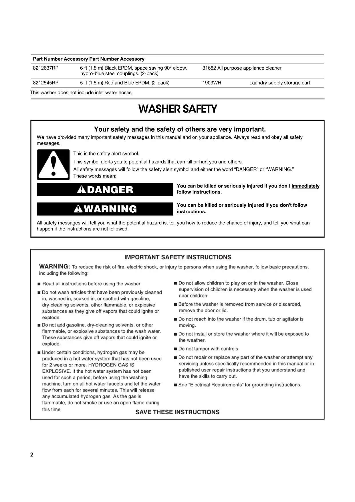 Whirlpool Canada LP Custom er Interaction Centre 1901 Minnesota Court Mississauga, Ontario L5N 3A7 In Canada, visit w ww.whirlpoolparts.ca. Please include a daytime phone number in your correspondence. Keep this book and your sales slip together for future reference. You must provide proof of purchase or installation date for in-warranty service. Write down the following information about your appliance to help you obtain assistance or service if you ever need it. You will need to know your complete model number and serial number. You can find this information on the model and serial number label, located under the washer lid. Dealer name____________________________________________________ Serial number __________________________________________________ Address ________________________________________________________ Phone number__________________________________________________ Model number __________________________________________________ Purchase date __________________________________________________ Accessories Enhance your washer with these premium accessories. For more high-quality items or to order, call 1-800 -901-2042, or visit us at www.applianceaccessories.com. In Canada, call 1-800-807-6777 or visit us at www.whirlpoolparts.ca. Part Number Accessory Part Number Accessory 8212656RP 10 ft (3.0 m) Black EPDM (2 pack) 8212641RP 5 ft (1.5 m) Black EPDM (2 pack) 8212638RP 6 ft (1.8 m) Nylon braided spac e-saving fill hose, 90° elbow, hypro-blue steel couplings. (2-pack) 8212546RP 4 ft (1.2 m) Black EPDM (2 pack) 8212487RP 5 ft (1.5 m) Nylon braided fill hose. (2-pack) 8212526 Washer drip tray, fits under all2 This washer does not include inlet water hoses. WASHER SAFETY You can be killed or seriously injured if you don't immediately You can be killed or seriously injured if you don'tfollow All safety messages will tell you what the potential hazard is, tell you how to reduce the chance of injury, and tell you what can happen if the instructions are not followed. Your safety and the safety of others are very important. We have provided many important safety messages in this manual and on your appliance. Always read and obey all safety messages.This is the safety alert symbol.This symbol alerts you to potential hazards that can kill or hurt you and others.All safety messages will follow the safety alert symbol and either the word “DANGER” or “WARNING.”These words mean:follow instructions.instructions. DANGER WARNING 8212637RP 6 ft (1.8 m) Black EPDM, space saving 90° elbow, hypro-blue steel couplings. (2-pack)31682 All purpose appliance cleaner 8212545RP 5 ft (1.5 m) Red and Blue EPDM. (2-pack) 1903WH Laundry supply storage cart Part Number Accessory Part Number Accessory3 WASHER USE Starting Your Washer Fire Hazard Never place items in the washer that are dampened with gasoline or other flammable fluids. No washer can completely remove oil. Do not dry anything that has ever had any type of oil on it (including cooking oils). Doing so can result in death, explosion, or fire. WARNING Electrical Shock HazardPlug into a grounded 3 prong outlet.Do not remove ground prong.Do not use an adapter.Do not use an extension cord.Failure to follow these instructions can result in death, fire, or electrical shock. WARNING 1. Measure detergent and pour it into the washer. If desired, add powdered or liquid color safe bleach. 2. Drop a sorted load of clothes loosely into your washer. ■ Load evenly to maintain washer balance. Mix large and small items. Items should move easily through the wash water. ■ Load only to the top of the basket as shown. Overloading can cause poor cleaning. 3. (OPTIONAL) Add liquid chlorine bleach.NOTE: Follow the garment and the chlorine bleach manufacturers’ directions for proper use. Undiluted bleach will damage any fabric it touches. The damage appears as rips, holes, tears, or color loss and may not show up until several washings later. To avoid spilling, use a cup with a pouring spout. Do not let bleach splash, drip, or run down into the washer basket. Always measure liquid chlorine bleach. Do not guess. Do not use more than the manufacturer’s recommended amount for a full load. Use less with a smaller load size.Style 1: With liquid chlorine bleach dispenser (on some models)■ Use only liquid chlorine bleach in this dispenser. Do not use this dispenser to add powdered chlorine or color-safe bleach to your load. Pour measured liquid chlorine bleach into the liquid chlorine bleach dispenser. Bleach is immediately fed into washer and is diluted automatically during the wash part of the cycle. Style 2: Without liquid chlorine bleach dispenser (on some models)■ Let the washer fill and begin agitating the load. ■ Add bleach 5 minutes into the wash cycle for best cleaning and so that bleach can be removed in the rinse cycle. Pour bleach around the agitator, not directly onto the load to avoid damaging clothing or other items in the load.4