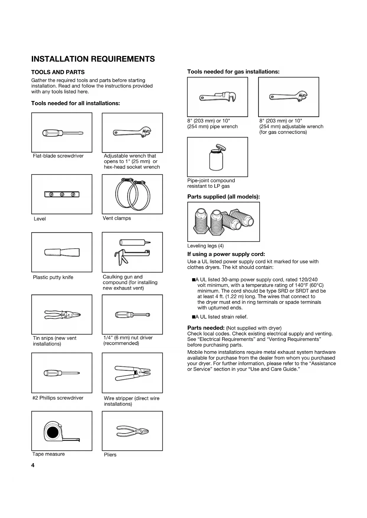 Gather the required tools and parts before starting installation. Read and follow the instructions provided with any tools listed here. Tools needed for all installations: Level #2 Phillips screwdriver Wire stripper (direct wire installations) Parts needed: (Not supplied with dryer) Check local codes. Check existing electrical supply and venting. See “Electrical Requirements” and “Venting Requirements” before purchasing parts. Mobile home installations require metal exhaust system hardware available for purchase from the dealer from whom you purchased your dryer. For further information, please refer to the “Assistance or Service” section in your “Use and Care Guide.” Parts supplied (all models): Flat-blade screwdriver Adjustable wrench that opens to 1" (25 mm) or hex-head socket wrench Tin snips (new vent installations) Caulking gun and compound (for installing new exhaust vent) Vent clamps 1/4" (6 mm) nut driver (recommended) Tools needed for gas installations: 8" (203 mm) or 10" (254 mm) pipe wrench 8" (203 mm) or 10" (254 mm) adjustable wrench (for gas connections) Pipe-joint compound resistant to LP gas Plastic putty knife INSTALLATION REQUIREMENTS Leveling legs (4) Tape measure Pliers If using a power supply cord: Use a UL listed power supply cord kit marked for use with clothes dryers. The kit should contain: ■ A UL listed 30-amp power supply cord, rated 120/240 volt minimum, with a temperature rating of 140°F (60°C) minimum. The cord should be type SRD or SRDT and be at least 4 ft. (1.22 m) long. The wires that connect to the dryer must end in ring terminals or spade terminals with upturned ends. ■ A UL listed strain relief.5 LOCATION REQUIREMENTS You will need: ■ A location allowing for proper exhaust installation. See “Venting Requirements.” ■ A separate 15 or 20-amp circuit needed for gas dryers and 30-amp circuit needed for electric dryers. ■ If using power supply cord, a grounded electrical outlet located within 2 ft. (610 mm) of either side of dryer. See “Electrical Requirements.” ■ Floor must support dryer weight of 200 lbs. (90.7 kg). Also consider weight of companion appliance. ■ Level oor with maximum slope of 1" (25 mm) under entire dryer. If slope is greater than 1" (25 mm), clothes may not tumble properly and automatic sensor cycles may not operate correctly. ■ For garage installation, place dryer at least 18" (460 mm) above oor. IMPORTANT: Do not operate, install, or store dryer where it will be exposed to water, weather, or at temperatures below 45°F (7°C). Lower temperatures may cause dryer not to shut off at end of automatic sensor cycles, resulting in longer drying times. NOTE: No other fuel-burning appliance can be installed in the same closet as a dryer. DRYER DIMENSIONS INSTALLATION CLEARANCES For each arrangement, consider allowing more space for ease of installation and servicing, spacing for companion appliances and clearances for walls, doors, and oor moldings. Space must be large enough to allow door to fully open. Add spacing on all sides of dryer to reduce noise transfer. If a closet door or louvered door is installed, top and bottom air openings in door are required. Check code requirements. Some codes limit, or do not permit, installation of the dryer in garages, closets, mobile homes, or sleeping quarters. Contact your local building inspector. A. Wide opening side-swing door B. Wide opening hamper door *Most installations require a minimum 6" (152 mm) clearance behind the dryer for the exhaust vent with elbow. See “Venting Requirements.” 53"(1341 mm)30"(762 mm)