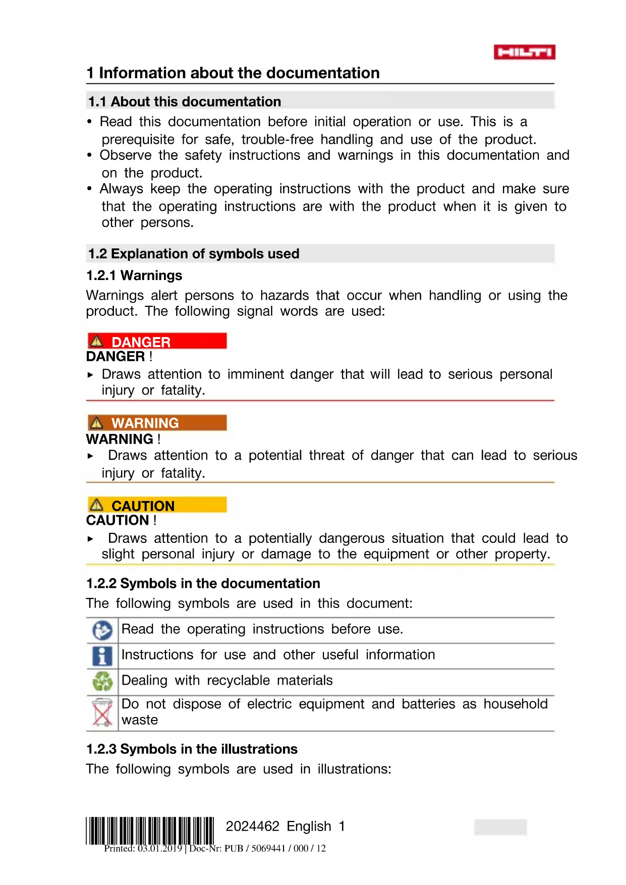 - After cleaning and maintenance, fit all guards or protective devices and check that they function correctly. To help ensure safe and reliable operation, use only genuine Hilti spare parts and consumables. Spare parts, consumables and accessories approved by Hilti for use with the product can be found at your local Hilti Store or online at: www.hilti.group. Printed: 03.01.2019 | Doc-Nr: PUB / 5069441 / 000 / 1210 English 2024462 *2024462* 8 Disposal WARNING Risk of injury. Hazards presented by improper disposal. ▶ Improper disposal of the equipment may have the following conse- quences: The burning of plastic components generates toxic fumes which may present a health hazard. Batteries may explode if damaged or exposed to very high temperatures, causing poisoning, burns, acid burns or environmental pollution. Careless disposal may permit unauthorized and improper use of the equipment. This may result in serious personal injury, injury to third parties and pollution of the environment. ▶ Dispose of defective batteries right away. Keep them out of reach of children. Do not disassemble or incinerate the batteries. ▶ Batteries that have reached the end of their life must be disposed of in accordance with national regulations or returned to Hilti. Most of the materials from which Hilti tools and appliances are manu- factured can be recycled. The materials must be correctly separated before they can be recycled. In many countries, your old tools, machines or appli- ances can be returned to Hilti for recycling. Ask Hilti Service or your Hilti representative for further information. 9 Manufacturer’s warranty ▶ Please contact your local Hilti representative if you have questions about the warranty conditions. Printed: 03.01.2019 | Doc-Nr: PUB / 5069441 / 000 / 12*2024462* 2024462 Français 11 1 Indications relatives à la documentation