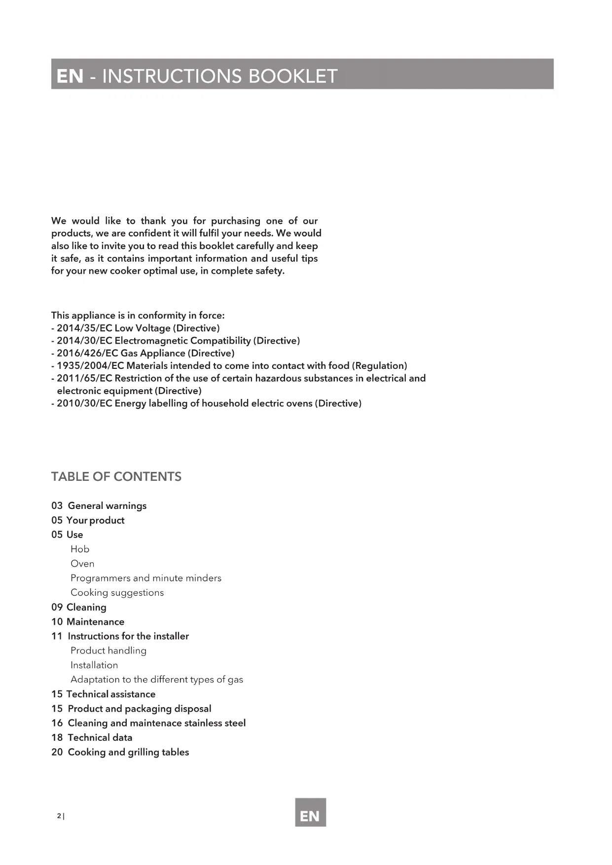 03 General warnings 05 Your product 05 Use Hob Oven Programmers and minute minders Cooking suggestions 09 Cleaning 10 Maintenance 11 Instructions for the installer Product handling Installation Adaptation to the different types of gas 15 Technical assistance 15 Product and packaging disposal 16 Cleaning and maintenace stainless steel 18 Technical data 20 Cooking and grilling tables We would like to thank you for purchasing one of our products, we are condent it will full your needs. We would also like to invite you to read this booklet carefully and keep it safe, as it contains important information and useful tips for your new cooker optimal use, in complete safety. This appliance is in conformity in force: - 2014/35/EC Low Voltage (Directive) - 2014/30/EC Electromagnetic Compatibility (Directive) - 2016/426/EC Gas Appliance (Directive) - 1935/2004/EC Materials intended to come into contact with food (Regulation) - 2011/65/EC Restriction of the use of certain hazardous substances in electrical and electronic equipment (Directive) - 2010/30/EC Energy labelling of household electric ovens (Directive)