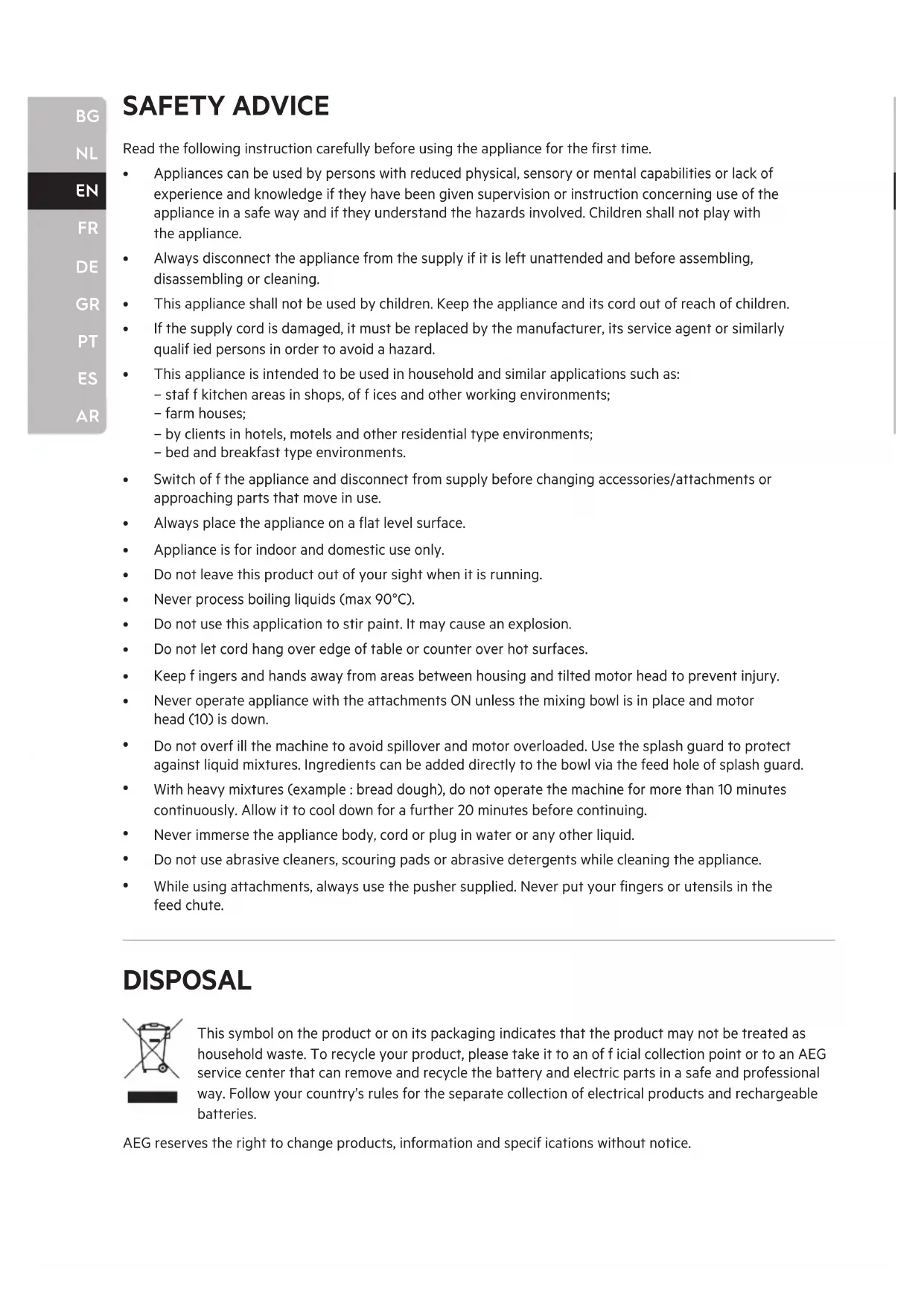 ARSAFETY ADVICE DISPOSAL This symbol on the product or on its packaging indicates that the product may not be treated as household waste. To recycle your product, please take it to an of f icial collection point or to an AEG service center that can remove and recycle the battery and electric parts in a safe and professional way. Follow your country’s rules for the separate collection of electrical products and rechargeable batteries. AEG reserves the right to change products, information and specif ications without notice. Read the following instruction carefully before using the appliance for the first time.