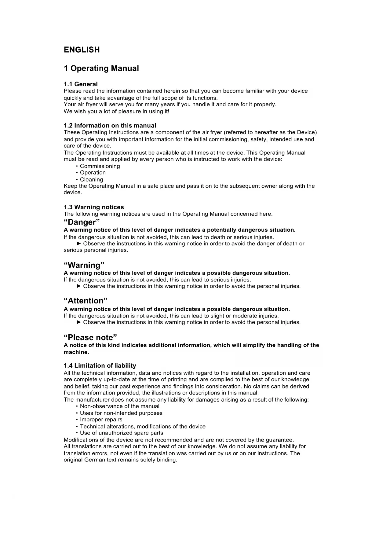 These Operating Instructions are a component of the air fryer (referred to hereafter as the Device) and provide you with important information for the initial commissioning, safety, intended use and care of the device.