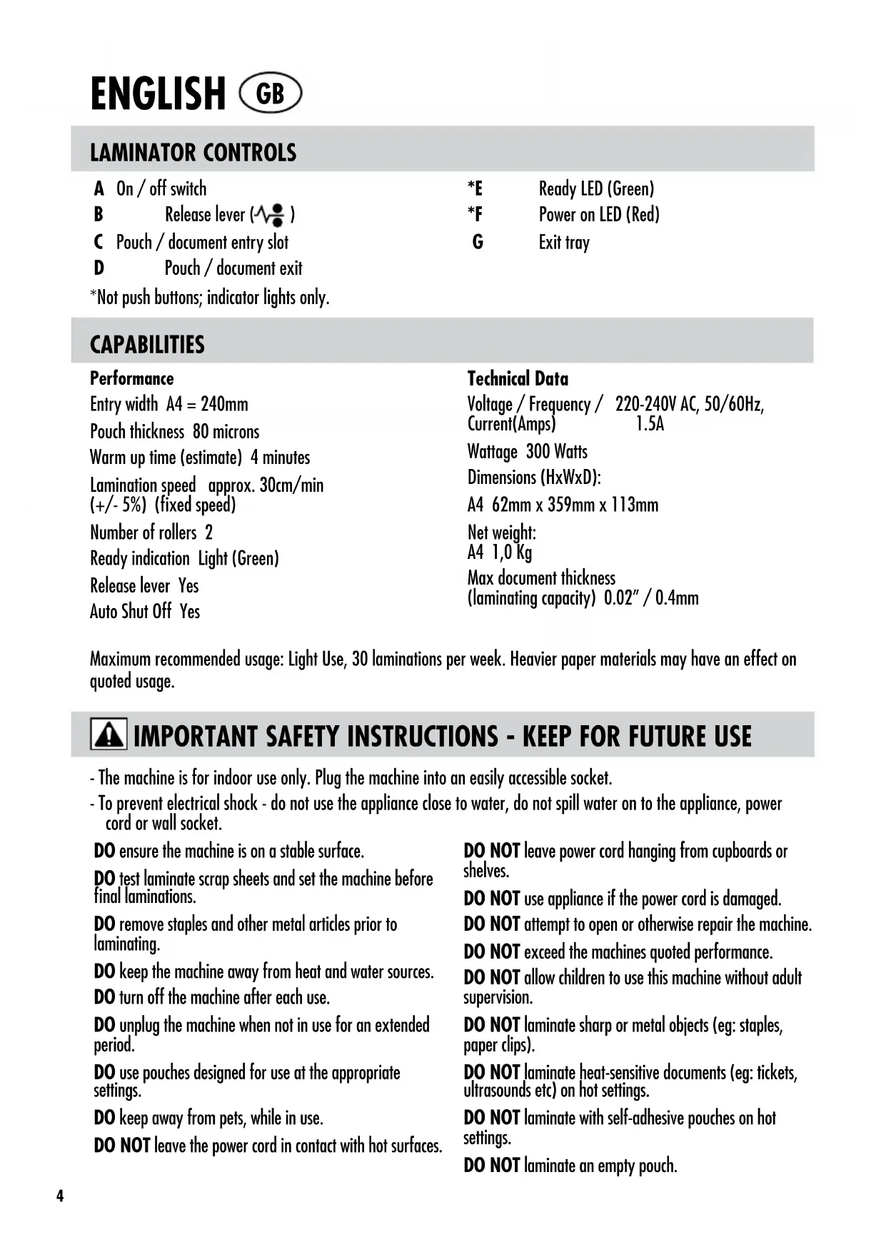CAPABILITIES Performance Entry width A4 = 240mm Pouch thickness 80 microns Warm up time (estimate) 4 minutes Lamination speed approx. 30cm/min (+/- 5%) (fixed speed) Number of rollers 2 Ready indication Light (Green) Release lever Yes Auto Shut Off Yes Technical Data Voltage / Frequency / 220-240V AC, 50/60Hz, Current(Amps) 1.5A Wattage 300 Watts Dimensions (HxWxD): A4 62mm x 359mm x 113mm Net weight: A4 1,0 Kg Max document thickness (laminating capacity) 0.02” / 0.4mm - The machine is for indoor use only. Plug the machine into an easily accessible socket. - To prevent electrical shock - do not use the appliance close to water, do not spill water on to the appliance, power cord or wall socket. DO ensure the machine is on a stable surface. DO test laminate scrap sheets and set the machine before final laminations. DO remove staples and other metal articles prior to laminating. DO keep the machine away from heat and water sources. DO turn off the machine after each use. DO unplug the machine when not in use for an extended period. DO use pouches designed for use at the appropriate settings. DO keep away from pets, while in use. DO NOT leave the power cord in contact with hot surfaces. DO NOT leave power cord hanging from cupboards or shelves. DO NOT use appliance if the power cord is damaged. DO NOT attempt to open or otherwise repair the machine. DO NOT exceed the machines quoted performance. DO NOT allow children to use this machine without adult supervision. DO NOT laminate sharp or metal objects (eg: staples, paper clips). DO NOT laminate heat-sensitive documents (eg: tickets, ultrasounds etc) on hot settings. DO NOT laminate with self-adhesive pouches on hot settings. DO NOT laminate an empty pouch. Maximum recommended usage: Light Use, 30 laminations per week. Heavier paper materials may have an effect on quoted usage. A On / off switch B Release lever (