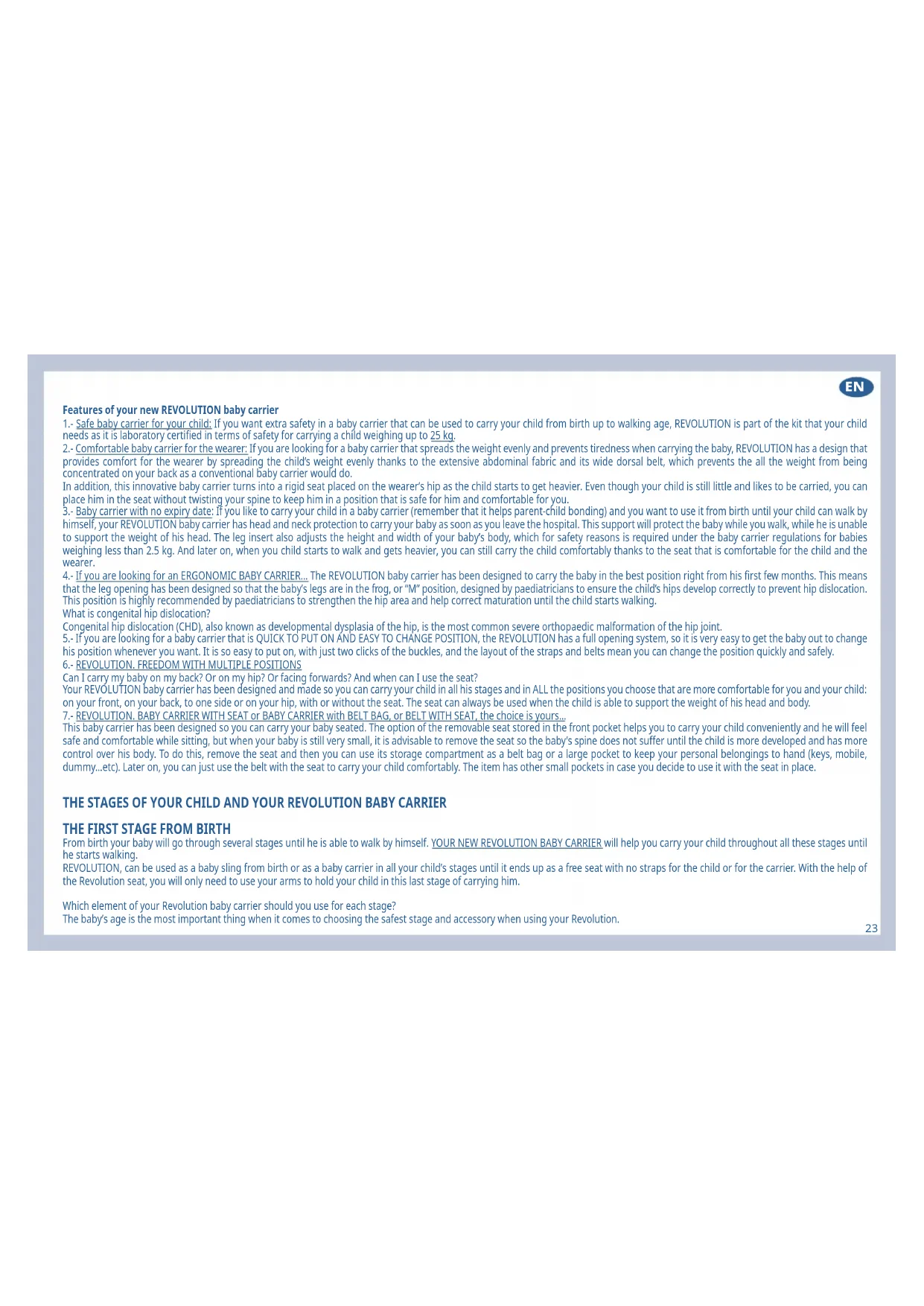 Your REVOLUTION baby carrier includes a completely innovative accessory that is a rigid seat built into the front waist belt. This type of baby carrier will be more comfortable for your child as it will support his bottom and his back in a seat that will make the carrier more relaxed and balanced. It will also be beneficial for you as well, because it means you won’t have to bend your back or waist (which normally happens) at all to settle the child’s weight at your waist. This version is safe for your child from the age of six months or when your baby is able to sit up unaided without falling. +0 MONTHS.- FRONT POSITION WITH INSERT + NECK AND HEAD PAD When the baby is newborn up until approximately 4½ months old, it is advisable to use the product as a baby carrier with the leg insert option (see page 4 letter H for the close-up of the parts) because the baby will still be very small and his body and legs need to be protected inside the baby carrier. The leg insert will prevent the child from falling through any of the side openings while helping to protect his body and keeping his bottom firmly in the baby carrier, to ensure he is correctly seated inside the REVOLUTION. During your baby’s first stage he should only be carried on your front (facing you). This will strengthen the bond between you while providing maximum protection and warmth. During this first stage the straps of your REVOLUTION play a very important role. The straps can be worn vertically straight or can be crossed over, but your baby should always be in the front carrying position until he can fully support the weight of his head. A – WITH VERTICAL STRAPS PARALLEL TO THE WEARER’S ARMS AND WITHOUT THE RIGID SEAT AND WITH THE INNER INSERT To position the baby in the insert, look at the drawings of the parts on page 4 and follow the steps shown in the drawings on page 6 for support: STEP 1. Separate the body of the baby carrier using the zip and remove the seat option included inside the baby carrier as standard when you buy it in the shop. Take the seat out of the front pocket and store it in the box with the instructions for use later on. Fold the pocket in half and close the zip on the pocket that is left when the seat is removed. Fasten the button to fold it completely. You can now use this pocket to hold your personal belongings. STEP 2. Reattach the body of your baby carrier to the band or abdominal belt this time using the zip along the top. Then, put the baby carrier on using the belt and fasten it at the waist using the buckles. Pull the straps to make sure the belt is the right size for you. The buckle will click when fastened properly. Make sure the buckles are securely fastened and roll up any surplus strap and secure it with the elastic band at the end, so it does not hang down and trip you up. Now attach the straps vertically and fit them (page 4 A) with the fastening buckles (page 4 B). Check that they are parallel to your arms. STEP 3. Take the leg insert of your REVOLUTION (see page 4 M) out of the inner pocket where it is kept and pull it towards you so it comes out. STEP 4. Unfasten the buttons on the flap or head pad attached to the top front part of the baby carrier (page 4 J). Pull the flap up and attach it to each side button of the shoulder straps. The buttons that remain free lower down are now used to fasten the leg insert. STEP 5. Hold your baby in your arms and sit down. Spread the baby carrier out and lie your baby on his back as if you were going to change his nappy. Then stretch the insert out and pass it between the baby’s legs. Fasten the insert by attaching the buttonholes to the buttons on the front. The insert will prevent the baby from slipping through the leg opening of the baby carrier while he is very small. Make sure that these buttons are fastened securely. As your baby grows you will notice that you no longer need to use the leg insert. Gradually his feet will come out through the opening, then his legs up to his knees. That will be the time to forget about using the leg insert and store it in the inner pocket inside the Revolution baby carrier. STEP 6. Insert your arm through one of the straps while holding the child against your chest with your other hand. Now change hands and put the second strap on still while holding your child securely against your chest. STEP 7. Lastly, fasten the buckle on your back so the straps do not slip off your shoulders and remain perfectly balanced. Check that your shoulders are at the same height and that the central straps are not too close to your neck, they should be in the middle of your back, just at the bottom of your shoulder blades. Adjust the height and width of the straps by pulling them. Notice the comfort of your baby carrier and the protection it gives your child. Be especially careful that none of your child’s extremities get caught between the abdominal belt and your waist, or between the side straps. Check your child’s mobility constantly. In a few months you will notice that your child is no longer a newborn and has become a baby with more control over his body, but he still won’t be able to support the weight of his head (this will happen when the child is around five or six months old), and your baby may have grown so much that you no longer need the leg insert. However, you should still use the head support element at this stage. That’s why it is a good idea to make sure that the head support pad is always well fitted and firm enough to be used as a headrest support.EN
