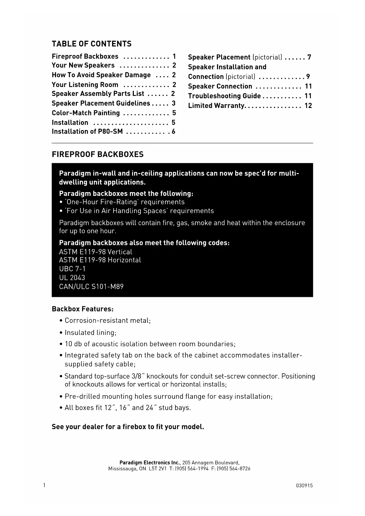 Dealer, Paradigm Electronics Inc. or Import Distributor (outside the U.S. and Canada) to arrange, bring in or ship prepaid, any defective unit. Visit our website, www.paradigm.com for more information. Paradigm Electronics Inc. reserves the right to improve the design of any product without assuming any obligation to modify any product previously manufactured. This warranty is in lieu of all other warranties expressed or implied, of merchantability, fitness for any particular purpose and may not be extended or enlarged by anyone. In no event shall Paradigm Electronics Inc., their agents or representatives be responsible for any incidental or consequential damages. Some jurisdictions do not allow limitation of incidental or consequential damages, so this exclusion may not apply to you. Retain manual and sales receipt for proof of warranty term and proof of purchase.NOTESMD1 BOÎTIERS ARRIÈRE À L’ÉPREUVE DU FEU Les applications Paradigm encastrées au mur et au plafond peuvent maintenant être adaptées aux applications pour maisons en rangée. Les boîtiers arrière Paradigm respectent les exigences suivantes :