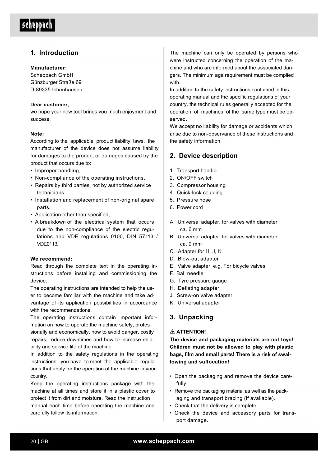 Manufacturer: Scheppach GmbH Günzburger Straße 69 D-89335 Ichenhausen Dear customer, we hope your new tool brings you much enjoyment and success. Note: According to the applicable product liability laws, the manufacturer of the device does not assume liability for damages to the product or damages caused by the product that occurs due to: