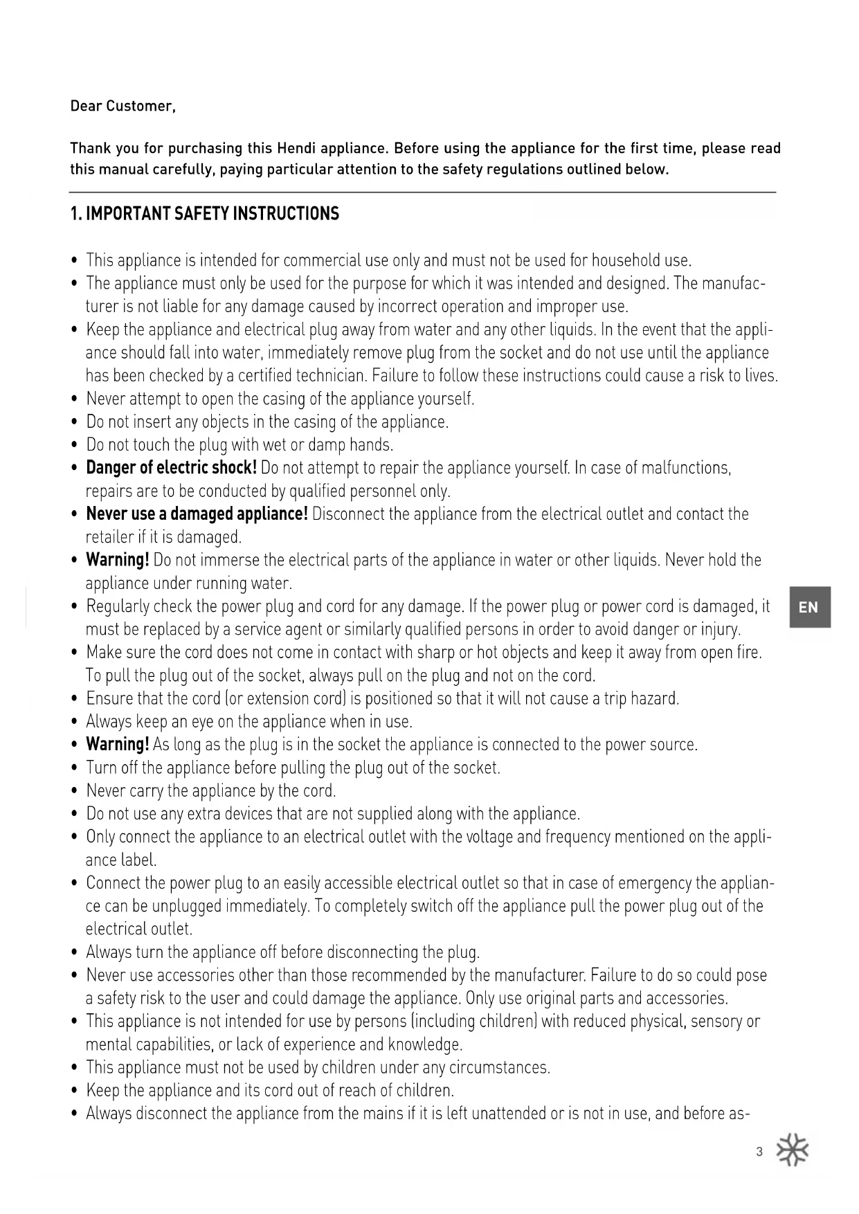Dear Customer, Thank you for purchasing this Hendi appliance. Before using the appliance for the first time, please read this manual carefully, paying particular attention to the safety regulations outlined below.