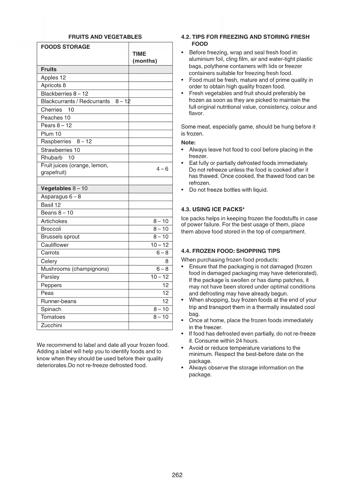 FOODS STORAGE TIME (months) Fruits Apples 12 Apricots 8 Blackberries 8–12 Blackcurrants/Redcurrants 8–12 Cherries 10 Peaches 10 Pears 8–12 Plum 10 Raspberries 8–12 Strawberries 10 Rhubarb 10 Fruitjuices(orange,lemon, grapefruit) 4–6 Vegetables 8–10 Asparagus 6–8 Basil 12 Beans 8–10 Artichokes 8–10 Broccoli 8–10 Brussels sprout 8–10 Cauliflower 10–12 Carrots 6–8 Celery 8 Mushrooms(champignons) 6–8 Parsley 10–12 Peppers 12 Peas 12 Runner-beans 12 Spinach 8–10 Tomatoes 8–10 Zucchini Werecommendtolabelanddateallyourfrozenfood. Adding a label will help you to identify foods and to know when they should be used before their quality deteriorates.Donotre-freezedefrostedfood.