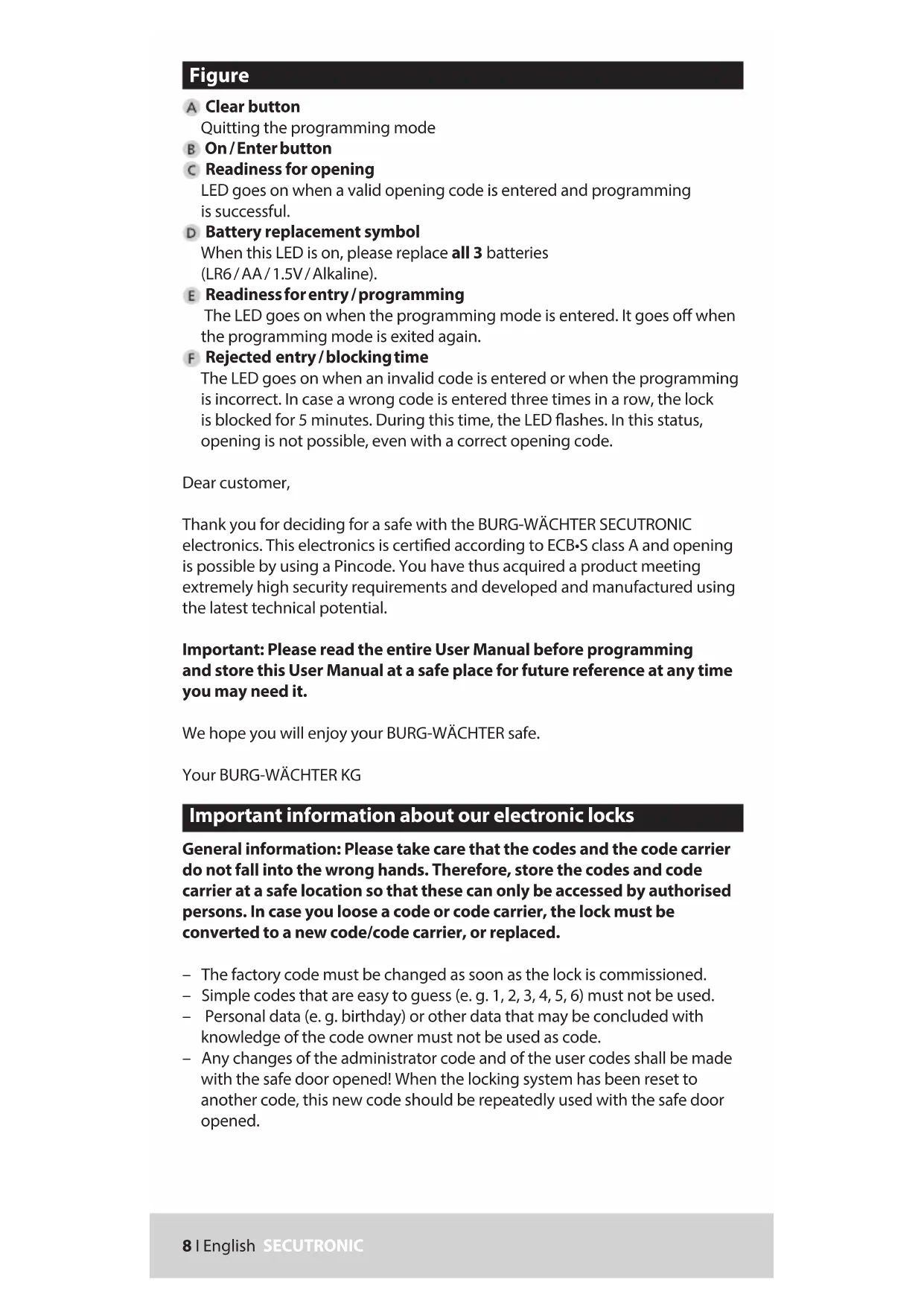 Thank you for deciding for a safe with the BURG-WACHTER SECUTRONIC electronics. This electronics is certified according to ECB-S class A and opening is possible by using a Pincode. You have thus acquired a product meeting extremely high security requirements and developed and manufactured using the latest technical potential.