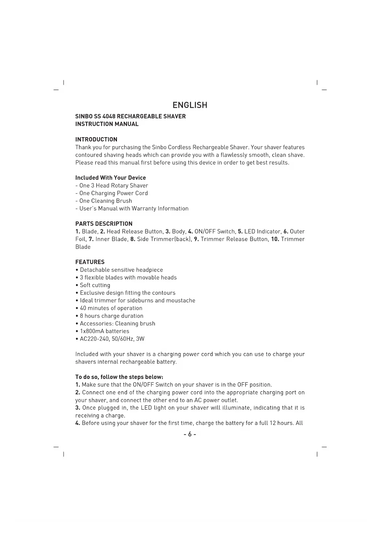 INSTRUCTION MANUAL INTRODUCTION Thank you for purchasing the Sinbo Cordless Rechargeable Shaver. Your shaver features contoured shaving heads which can provide you with a flawlessly smooth, clean shave. Please read this manual first before using this device in order to get best results. Included With Your Device - One 3 Head Rotary Shaver - One Charging Power Cord - One Cleaning Brush - User’s Manual with Warranty Information PARTS DESCRIPTION