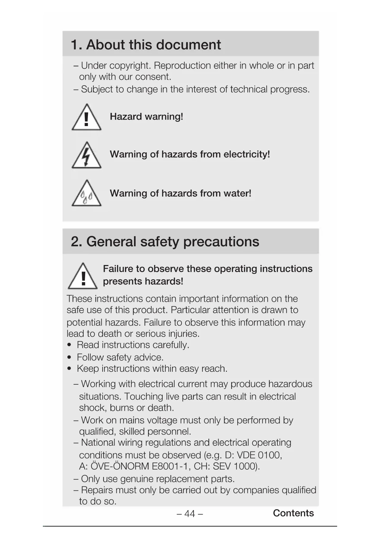 - Keep instructions within easy reach. – Working with electrical current may produce hazardous situations. Touching live parts can result in electrical shock, burns or death. – Work on mains voltage must only be performed by qualified, skilled personnel. – National wiring regulations and electrical operating conditions must be observed (e.g. D: VDE 0100, A: ÖVE-ÖNORM E8001-1, CH:SEV 1000). – Only use genuine replacement parts. – Repairs must only be carried out by companies qualified to do so.– 45 – Contents