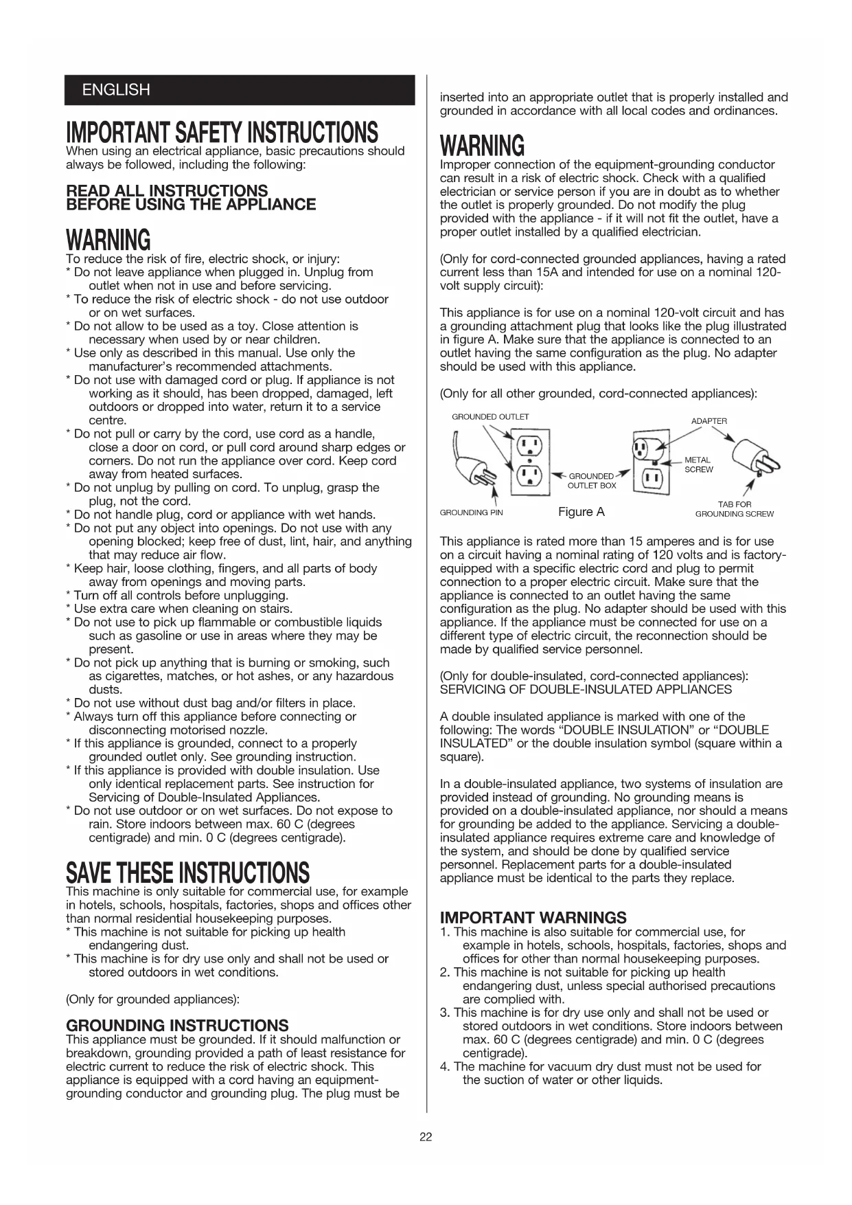 - This machine is for dry use only and shall not be used or stored outdoors in wet conditions. (Only for grounded appliances): GROUNDING INSTRUCTIONS This appliance must be grounded. If it should malfunction or breakdown, grounding provided a path of least resistance for electric current to reduce the risk of electric shock. This appliance is equipped with a cord having an equipment- grounding conductor and grounding plug. The plug must be inserted into an appropriate outlet that is properly installed and grounded in accordance with all local codes and ordinances. WARNING Improper connection of the equipment-grounding conductor can result in a risk of electric shock. Check with a qualified electrician or service person if you are in doubt as to whether the outlet is properly grounded. Do not modify the plug provided with the appliance - if it will not fit the outlet, have a proper outlet installed by a qualified electrician. (Only for cord-connected grounded appliances, having a rated current less than 15A and intended for use on a nominal 120- volt supply circuit): This appliance is for use on a nominal 120-volt circuit and has a grounding attachment plug that looks like the plug illustrated in figure A. Make sure that the appliance is connected to an outlet having the same configuration as the plug. No adapter should be used with this appliance. (Only for all other grounded, cord-connected appliances): This appliance is rated more than 15 amperes and is for use on a circuit having a nominal rating of 120 volts and is factory- equipped with a specific electric cord and plug to permit connection to a proper electric circuit. Make sure that the appliance is connected to an outlet having the same configuration as the plug. No adapter should be used with this appliance. If the appliance must be connected for use on a different type of electric circuit, the reconnection should be made by qualified service personnel. (Only for double-insulated, cord-connected appliances):