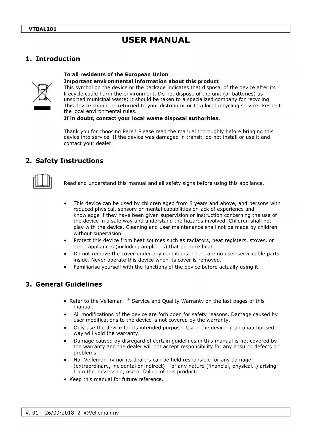 Use this device with original accessories only. Velleman nv cannot be held responsible in the event of damage or injury resulting from (incorrect) use of this device. For more info concerning this product and the latest version of this manual, please visit our website www.perel.eu. The information in this manual is subject to change without prior notice.