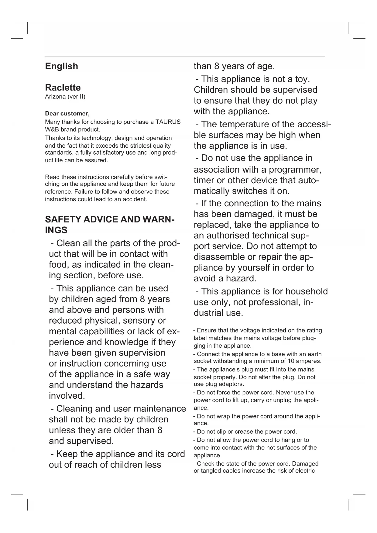 PRODUCT - The materials of which the packaging of this appliance consists are included in a collection, classication and recycling system. Should you wish to dispose of them, use the appropriate public recycling bins for each type of material. - The product does not contain concentrations of substances that could be considered harmful to the environment. This symbol means that in case you wish to dispose of the product once its working life has ended, take it to an authorised waste agent for the selective collection of Waste from Electric and Electronic Equipment (WEEE). This appliance complies with Directive 2014/35/ EU on Low Voltage, Directive 2014/30/EU on Electromagnetic Compatibility, Directive 2011/65/ EU on the restrictions of the use of certain hazardous substances in electrical and elec- tronic equipment and Directive 2009/125/EC on the ecodesign requirements for energy-related products.Français Raclette Arizona (ver II) Cher Client, Nous vous remercions d’avoir acheté un appareil