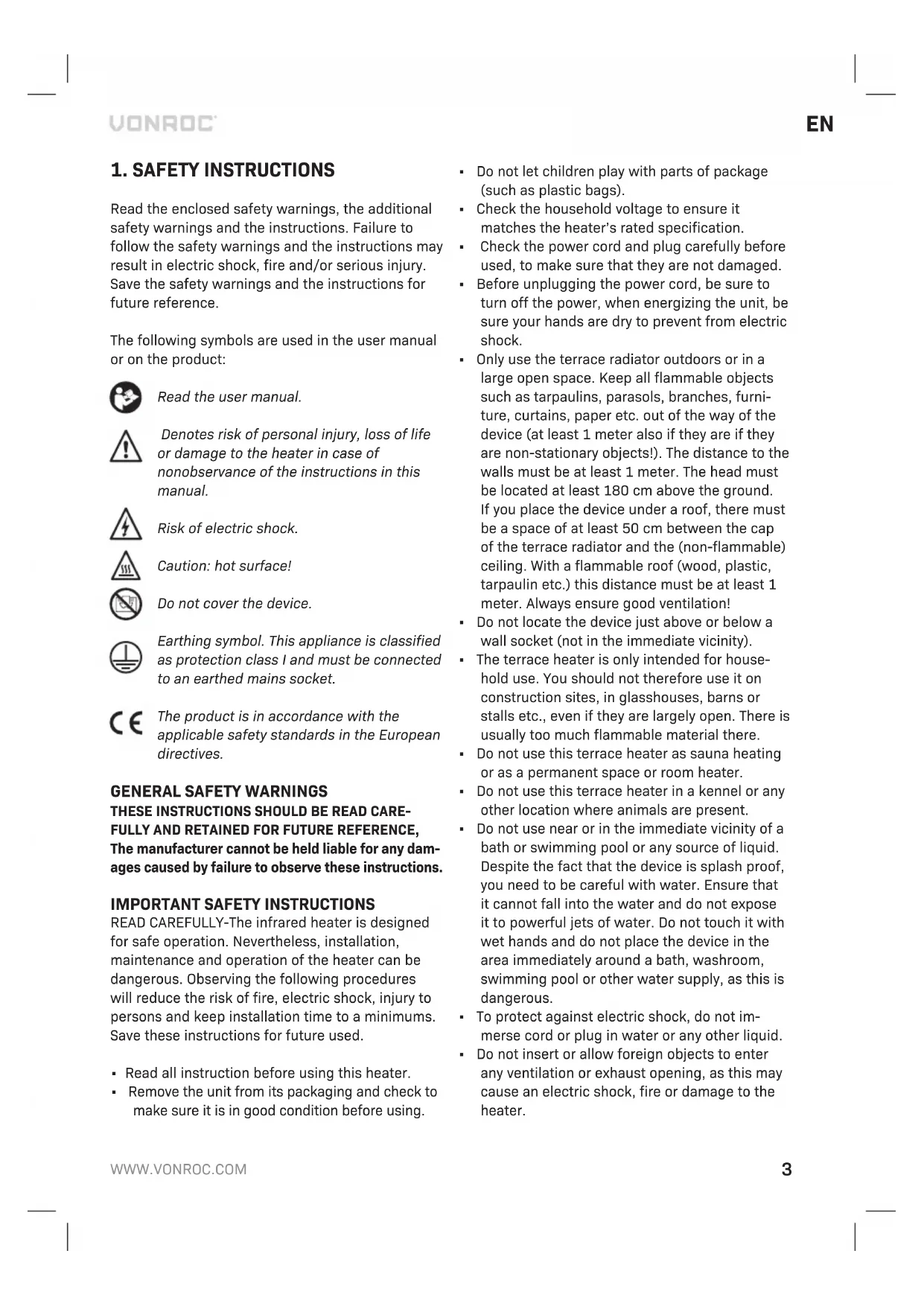 Read the enclosed safety warnings, the additional safety warnings and the instructions. Failure to follow the safety warnings and the instructions may result in electric shock, fire and/or serious injury. Save the safety warnings and the instructions for future reference. The following symbols are used in the user manual or on the product: Read the user manual. Denotes risk of personal injury, loss of life or damage to the heater in case of nonobservance of the instructions in this manual. Risk of electric shock. Caution: hot surface! Do not cover the device. Earthing symbol. This appliance is classified as protection class I and must be connected to an earthed mains socket. The product is in accordance with the applicable safety standards in the European directives.