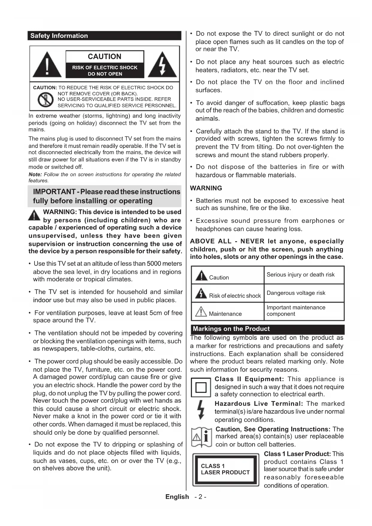 - Excessive sound pressure from earphones or headphones can cause hearing loss. ABOVE ALL - NEVER let anyone, especially children, push or hit the screen, push anything into holes, slots or any other openings in the case. Caution Serious injury or death risk Risk of electric shock Dangerous voltage risk Maintenance Important maintenance component Markings on the Product The following symbols are used on the product as a marker for restrictions and precautions and safety instructions. Each explanation shall be considered where the product bears related marking only. Note such information for security reasons. Class II Equipment: This appliance is designed in such a way that it does not require a safety connection to electrical earth. Hazardous Live Terminal: The marked terminal(s) is/are hazardous live under normal operating conditions.