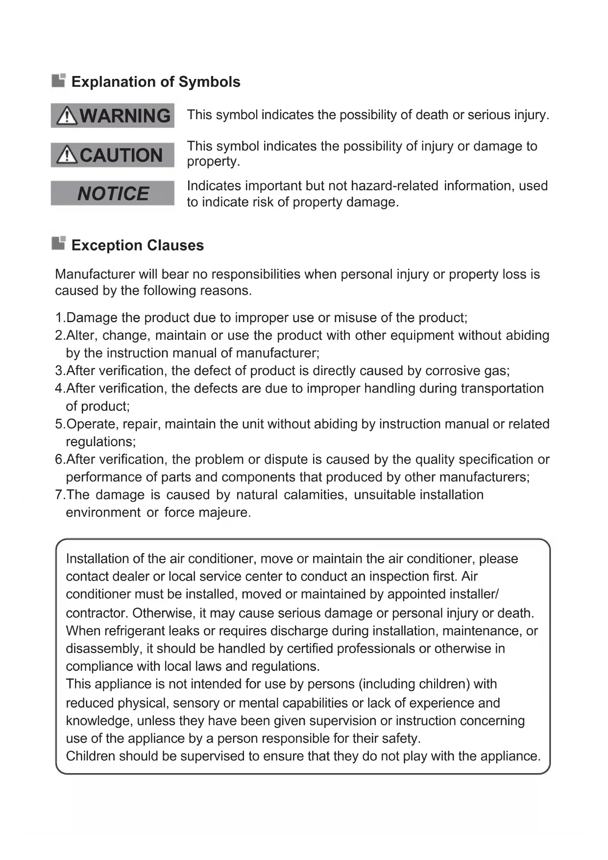 Installation of the air conditioner, move or maintain the air conditioner, please contact dealer or local service center to conduct an inspection first. Air conditioner must be installed, moved or maintained by appointed installer/ contractor. Otherwise, it may cause serious damage or personal injury or death. When refrigerant leaks or requires discharge during installation, maintenance, or disassembly, it should be handled by certified professionals or otherwise in compliance with local laws and regulations.